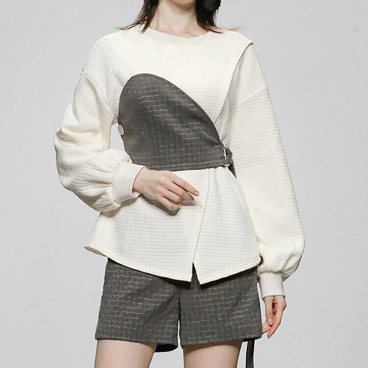 2セット セットアップ レディース トップス パンツ ボトムス プルオーバー トレーナー チュニック ショートパンツ ショート 長袖 パフスリーブ ドロップショルダー ラウンドネック アシンメトリー オーバーサイズ スリット ファスナー ポケット ハイウエスト かわいい 大人可愛い きれいめ シンプル カジュアル 上品 おしゃれ レトロ こなれ感 個性的 モード系 モダン 存在感 抜け感 チェック 春 秋 学生 学校 通学 お出かけ 女子会 普段使い 着回し S M L XL ゆったり ホワイト グレー