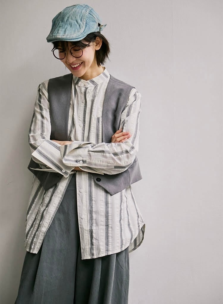 シンプルながらも上品でおしゃれなスタンドカラーの長袖シャツです。