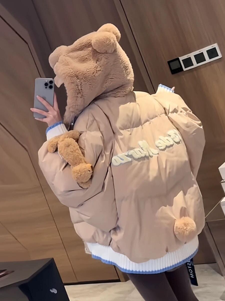 レディース ジャケット アウター ダウン ダウンジャケット ショート 長袖 フード ファスナー ポケット 前開き ジッパー 厚手 かわいい 大人可愛い きれいめ カジュアル 上品 おしゃれ かっこいい レトロ こなれ感 ラフ ガーリー ルーズ 主役級 存在感 抜け感 ラブリー キュート 学生風 熊 秋 冬 デート お出かけ お泊まり 旅行 レストラン 女子会 休日 ショッピング 韓国 オルチャン コーデ 暖かい 普段使い モテ トレンド 流行 インスタ映え 定番 S M L コーヒーブラウン