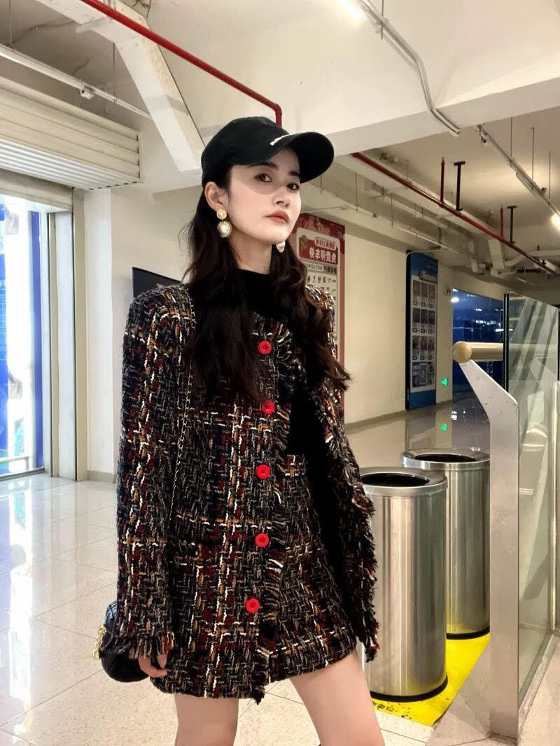 スタイリッシュでありながらカジュアルな印象を与えるジャケットとミニスカートのセットアップです。