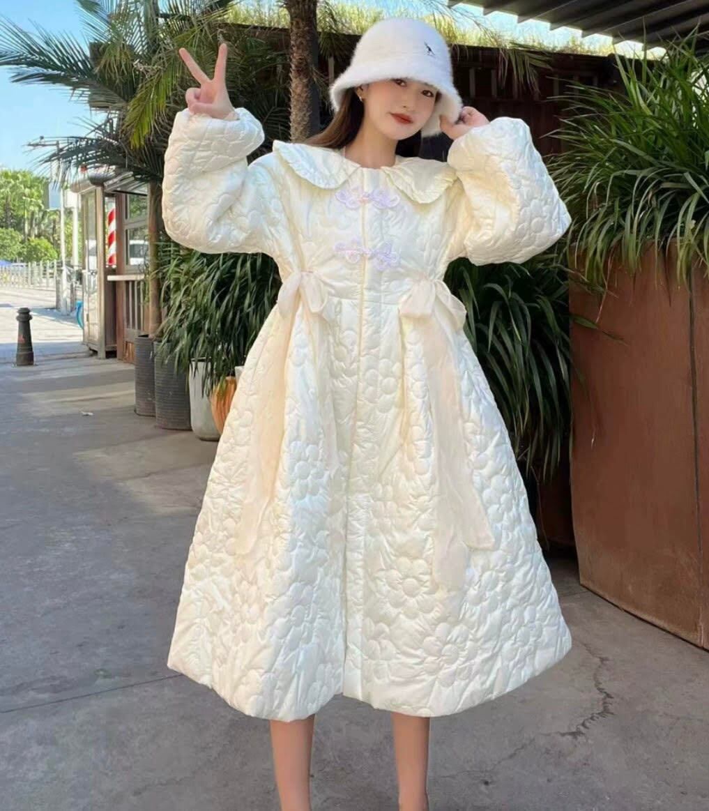 レディース コート アウター キルティングコート ミモレ 長袖 襟付き オーバーサイズ フリル リボン ポケット 前開き ボタン 厚手 かわいい 大人可愛い きれいめ カジュアル 上品 おしゃれ かっこいい レトロ こなれ感 ラフ ガーリー ルーズ エレガント ラブリー キュート 冬 デート お出かけ お泊まり 旅行 レストラン 女子会 休日 ショッピング 韓国 オルチャン コーデ 楽ちん 暖かい 普段使い モテ トレンド 流行 インスタ映え 定番 M L ベージュ