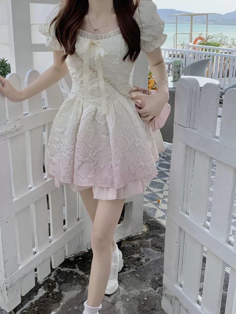 レディース トップス チュニック ワンピース マイクロミニ 半袖 パフスリーブ スクエアネック グラデーション スリム 細身 Aライン プリーツ フリル リボン ウエストマーク ハイウエスト かわいい 大人可愛い きれいめ カジュアル 上品 おしゃれ レトロ こなれ感 ガーリー 主役級 存在感 抜け感 ラブリー キュート プリンセス 夏 デート お出かけ お泊まり リゾート 旅行 女子会 休日 韓国 オルチャン コーデ 美脚 脚長 プチプラ 普段使い モテ 清楚 インスタ映え S M L ベージュ