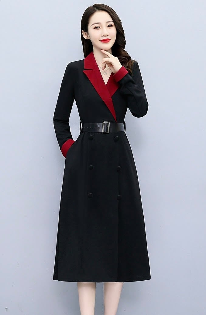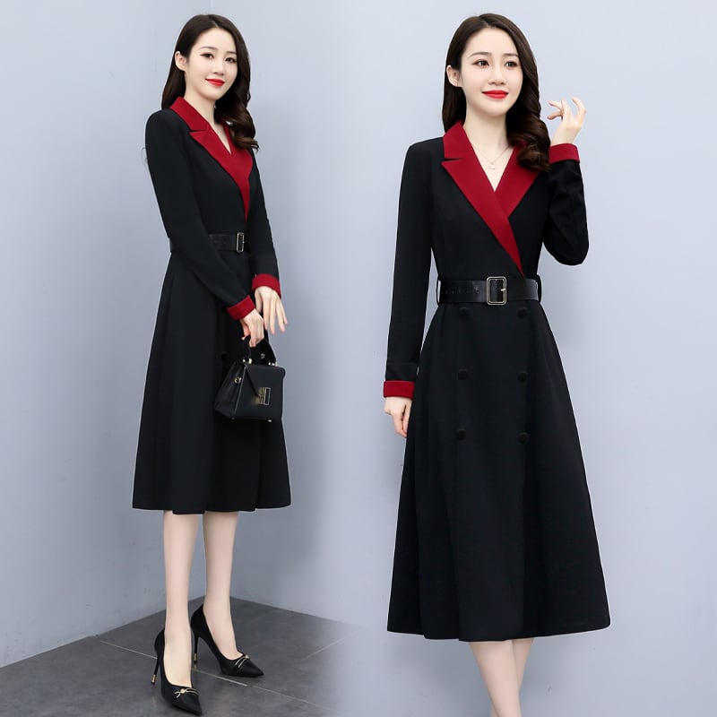 レディース ワンピース ミモレ 長袖 Vネック 襟付き スリム 細身 Aライン ベルト ボタン バイカラー かわいい 大人可愛い きれいめ カジュアル 上品 おしゃれ かっこいい レトロ こなれ感 クール モード系 エレガント モダン 主役級 存在感 抜け感 クラシカル ロマンティック 春 秋 デート お出かけ お泊まり パーティー イベント レストラン 女子会 ホテル ショッピング 韓国 オルチャン コーデ 美脚 脚長 モテ トレンド 流行 インスタ映え M L XL 2XL 黒 ブラック レッド