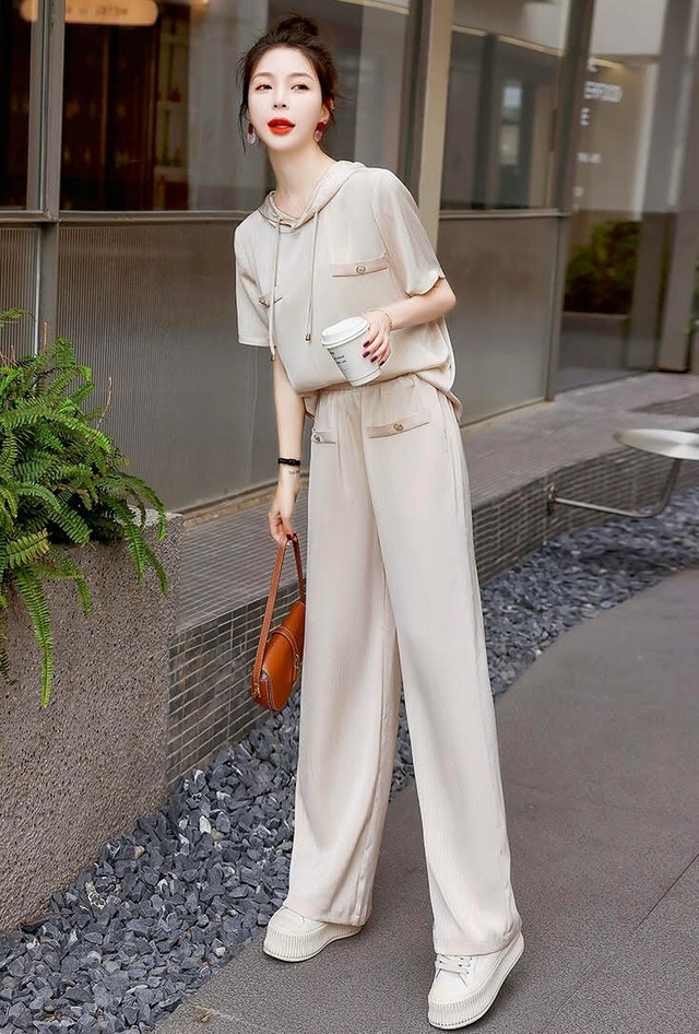 2セット セットアップ レディース トップス パンツ ボトムス プルオーバー パーカー デニムジャケット 半袖 襟なし フード ポケット ハイウエスト ウエストゴム かわいい 大人可愛い きれいめ シンプル カジュアル 上品 おしゃれ かっこいい レトロ こなれ感 スポーティー クール モード系 モダン 主役級 存在感 抜け感 無地 夏 デート お出かけ ジム 公園 女子会 休日 韓国 オルチャン コーデ 普段使い 着回し モテ トレンド 流行 インスタ映え 定番 M L XL 2XL ベージュ ピンク