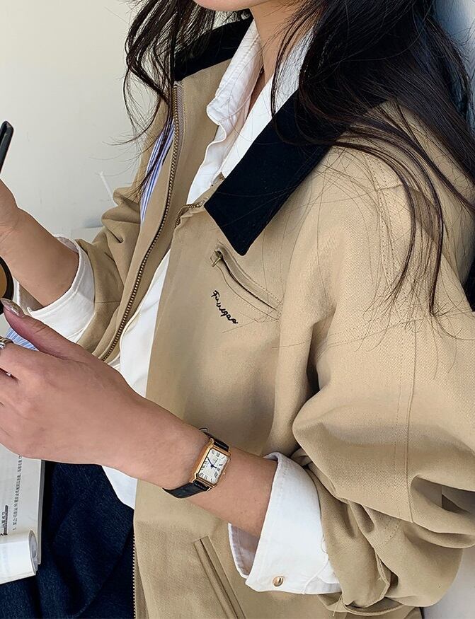 バイカラー ジップアップ ジャケットは、シンプルながらもおしゃれで、春秋冬通して活躍するアイテムです!さりげない角襟デザインが、カジュアルかつ大人可愛い印象を与えてくれます。前開きジッパーとポケットが機能的で、普段使いやお出かけ、デートにもピッタリ!ルーズなシルエットで、こなれ感を演出しつつ、ボーイッシュなスタイルにもマッチします。カーキの落ち着いた色合いは、様々なコーディネートに合わせやすく、学校や通勤、休日のショッピングなど幅広くご利用いただけます。