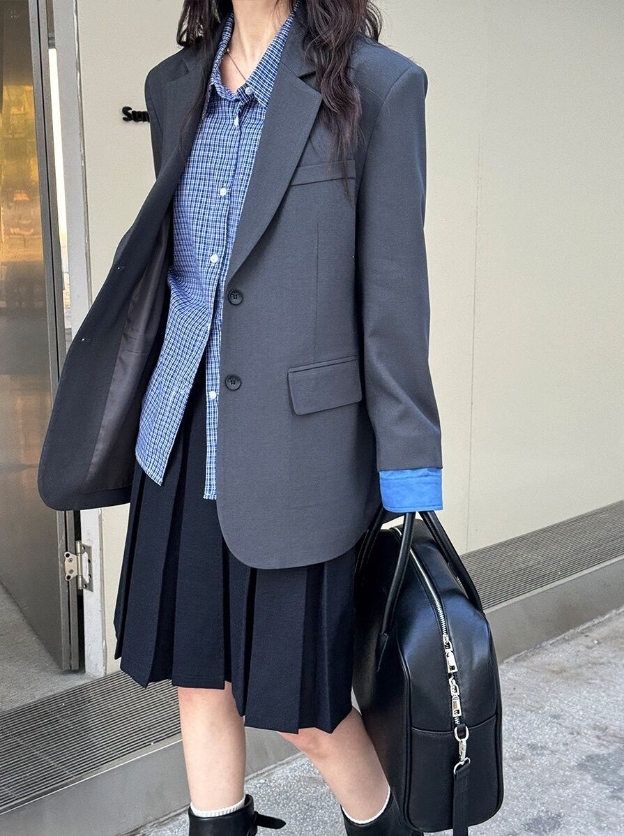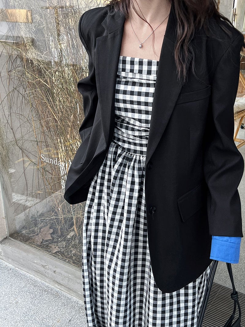 重ね着風 オーバーサイズ ルーズ テーラードジャケット レディース トップス ジャケット アウター 上着 レイヤード風 ブレザー 丈長 ミディアム 長袖 Vネック 襟付き ポケット 前開き ボタン かわいい 大人可愛い シンプル カジュアル 上品 おしゃれ こなれ感 フォーマル カレッジ風 学生風 無地 春 秋 冬 ママ オフィス 通勤 学生 学校 通学 デート お出かけ 旅行 公園 女子会 休日 ショッピング カフェ 重ね着 体型カバー 着回し レイヤード M L ゆったり 黒 ブラック グレー