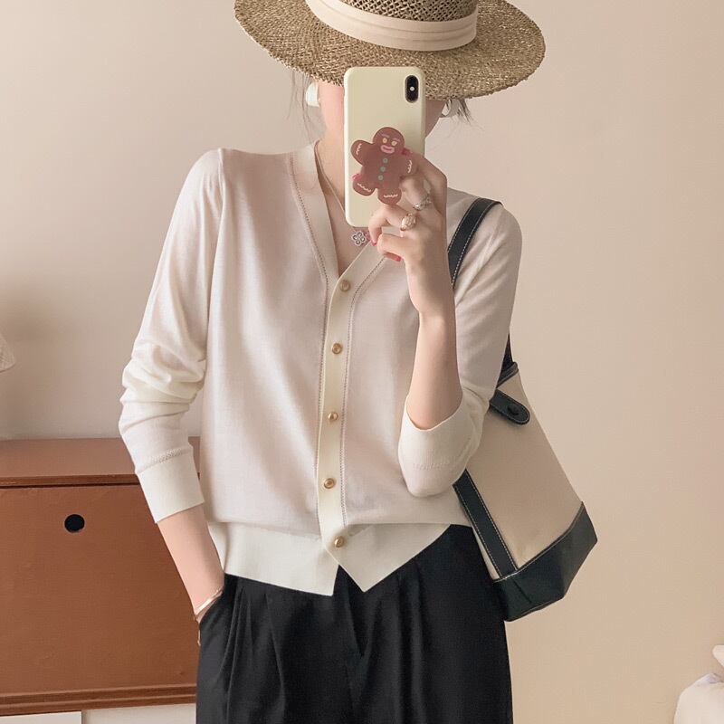 ゴールドボタンがアクセントのVネックニットカーディガンは、シンプルでありながらも大人可愛いデザインが特徴的なアイテムです!襟なしの前開きスタイルで、カジュアルからきれいめまで幅広く着回しが可能。春、秋、冬の3シーズンで活躍することで、通勤やデート、お出かけ時の重ね着にも最適です。体型カバー効果もあるため、普段使いやおしゃれなレイヤードスタイルにもぴったりです。