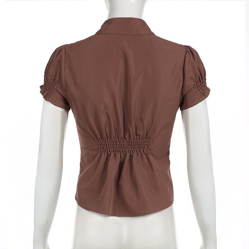 プリーツ 半袖 シャツ ブラウス レディース ショート パフスリーブ フレンチスリーブ 襟付き 角襟 ポロカラー スリム フェミニン へそ出し タック タックプリーツ 伸縮性 ボタン シャーリング かわいい 大人可愛い きれいめ シンプル カジュアル おしゃれ ガーリー 無地 春 夏 秋 ママ 通勤 学生 学校 通学 デート お出かけ 旅行 公園 女子会 休日 ショッピング カフェ 普段使い 着回し S M L 茶色 ブラウン