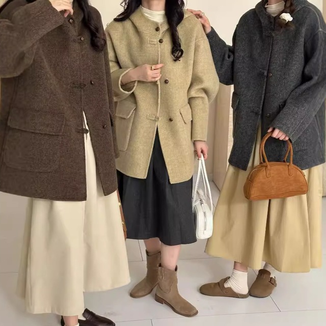 フード付き ウールコート レディース コート アウター 上着 羽織 丈長 ミディアム 長袖 ドロップショルダー フード ポケット 前開き ボタン かわいい 大人可愛い シンプル カジュアル おしゃれ かっこいい こなれ感 ルーズ 無地 春 秋 ママ 通勤 学生 学校 通学 デート お出かけ 旅行 公園 女子会 休日 ショッピング カフェ 重ね着 暖かい 防寒 体型カバー 普段使い 着回し レイヤード S M ゆったり ダークグレー バニライエロー ナッツブラウン