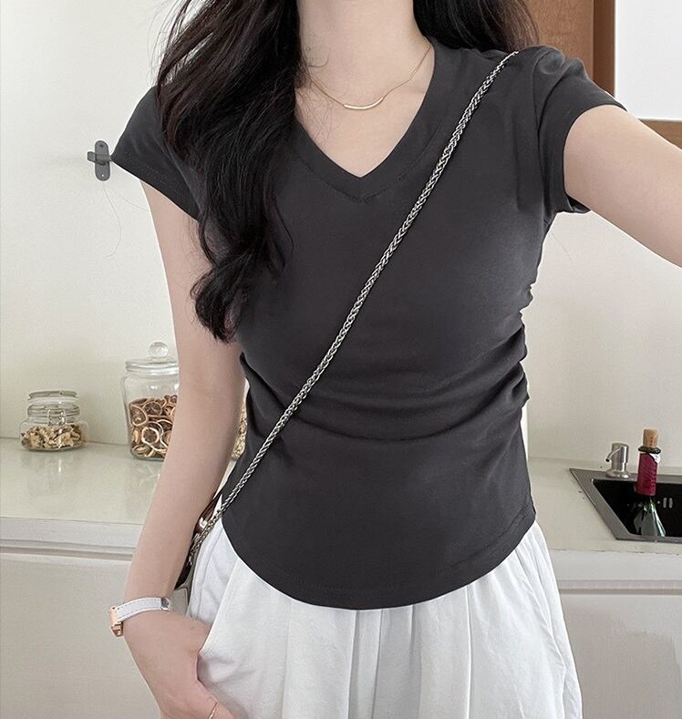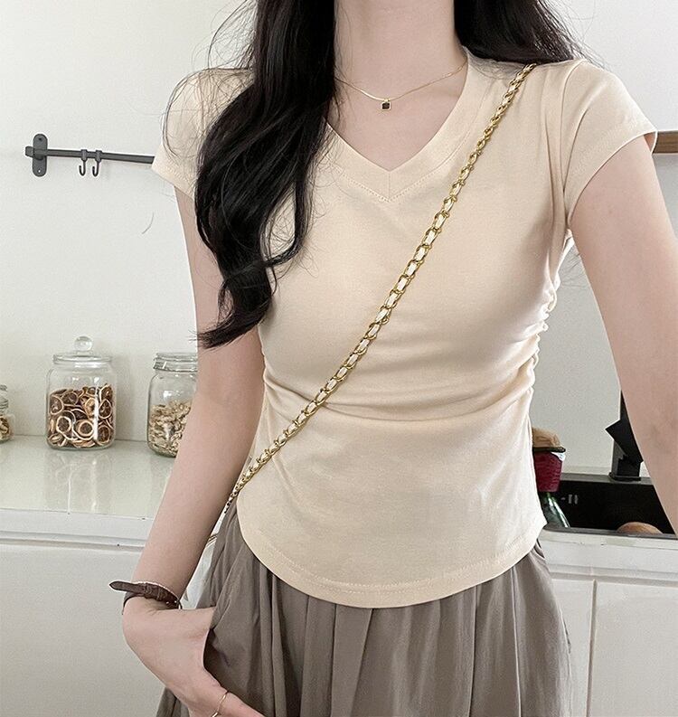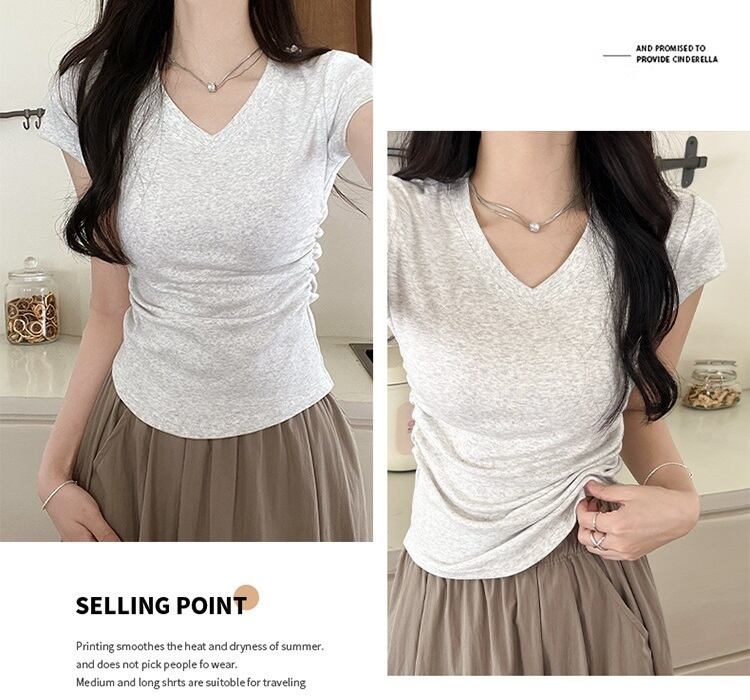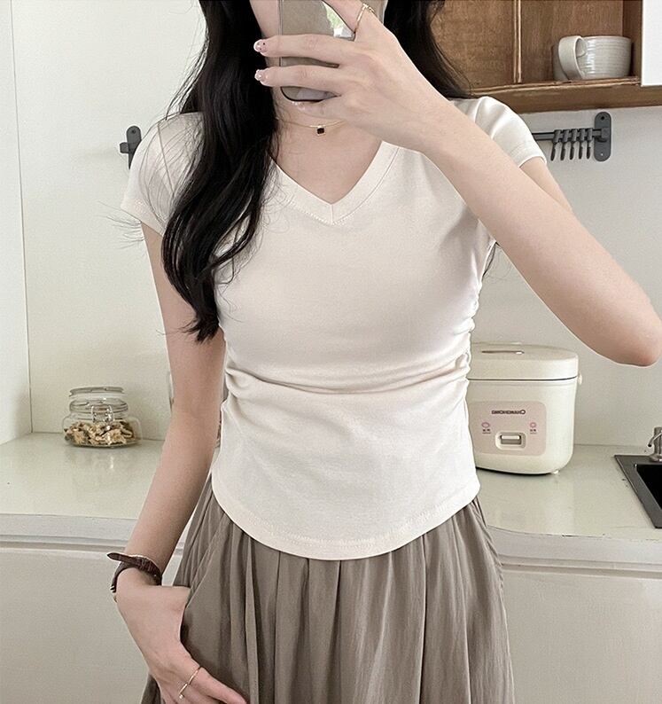 この2タイプのラウンドネックとVネック 半袖 Tシャツは、シンプルでありながらも大人可愛い印象を与えるアイテムです!襟なしのデザインが特徴で、細身のシルエットが美しいラインを演出します。ベーシックな無地カラーで、普段使いやデート、お出かけにもぴったりの一着です。カジュアルでおしゃれな雰囲気を楽しむことができるので、春・夏・秋のシーズンにさまざまなコーディネートが可能です。