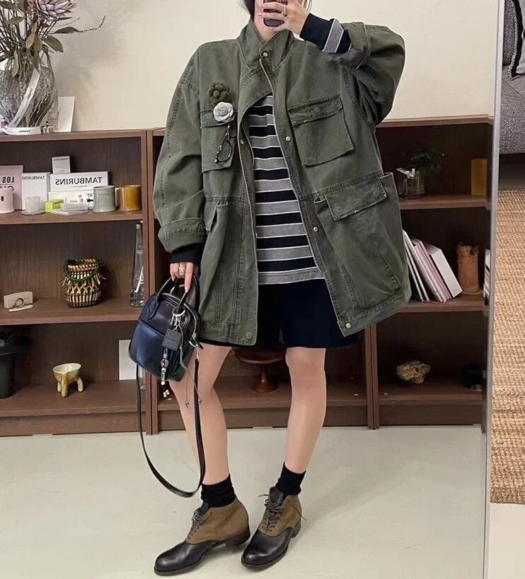大きめポケット ルーズ デニムジャケット レディース トップス ジャケット アウター 上着 羽織 丈長 ミディアム 長袖 ドロップショルダー 襟付き スタンドカラー オーバーサイズ ファスナー ポケット 前開き ボタン ヴィンテージ デニム かわいい 大人可愛い シンプル カジュアル おしゃれ かっこいい レトロ メンズライク 無地 春 秋 冬 ママ 通勤 学生 学校 通学 デート お出かけ 旅行 公園 女子会 休日 体型カバー 普段使い 着回し 定番 S M L XL ゆったり ヴィンテージグリーン