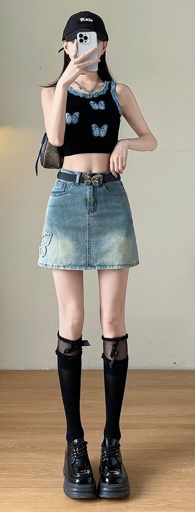 大人かわいいイメージを演出する「バタフライ柄 デニム ミニスカート」のご案内です!