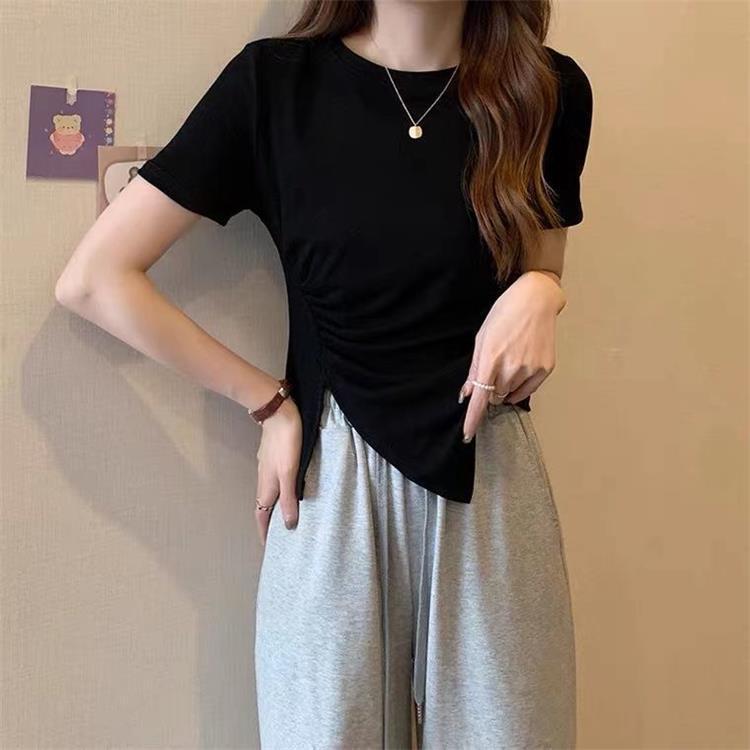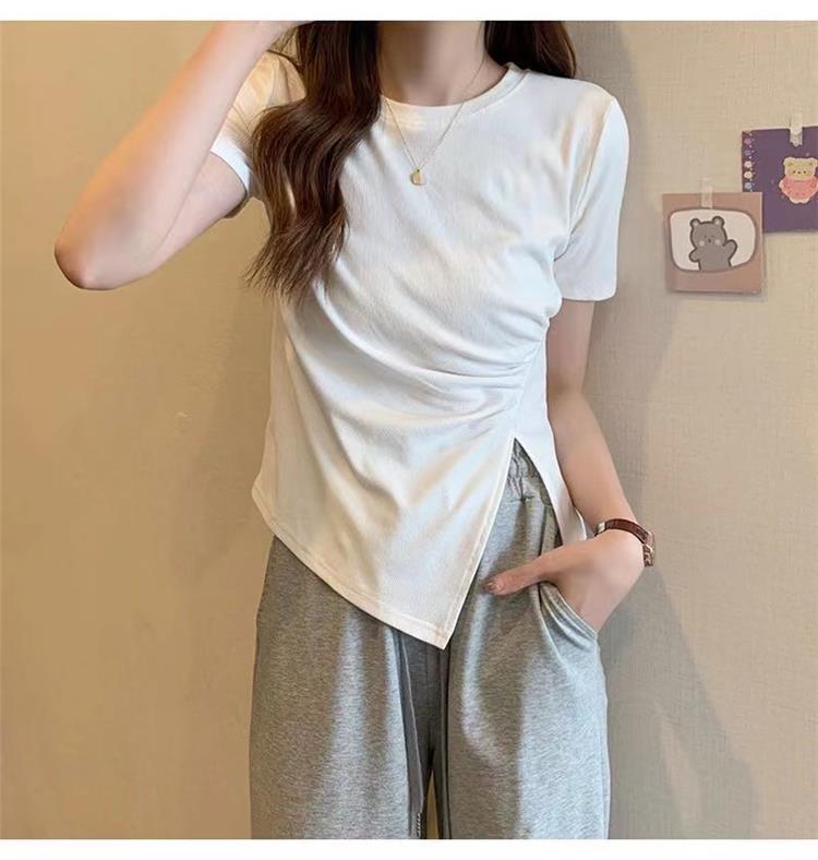 アシンメトリー 半袖 Tシャツ レディース トップス カットソー プルオーバー ミディアム 半袖 襟なし スリム 細身 アシンメトリー スリット サイドスリット ギャザー かわいい 大人可愛い シンプル カジュアル おしゃれ こなれ感 無地 春 夏 秋 ママ 通勤 学生 学校 通学 デート お出かけ 旅行 公園 女子会 休日 ショッピング カフェ 重ね着 体型カバー 普段使い 着回し レイヤード S M L XL 2XL 白 ホワイト 黒 ブラック グレー