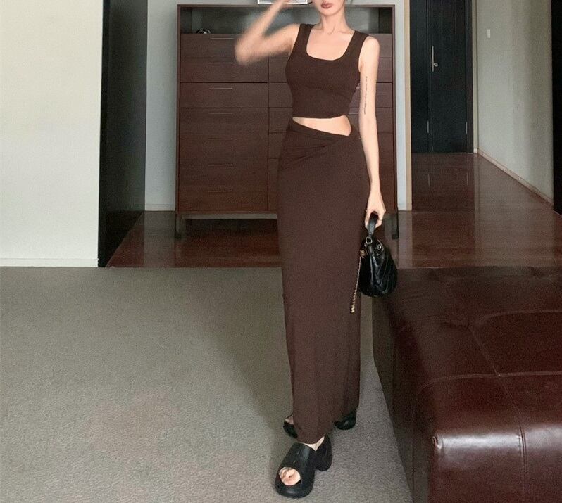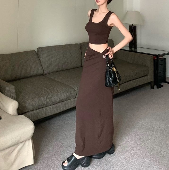 セットアップ ショート丈 タンクトップ ロングスカート 2点セット 上下セット レディース スカート トップス ボトムス ルームウェア 部屋着 マーメイドスカート ショート ロング 袖なし ノースリーブ Uネック 襟なし フレア スリム 細身 マーメイド ドレープ へそ出し ハイウエスト かわいい 大人可愛い シンプル カジュアル おしゃれ セクシー 無地 春 夏 秋 ママ 通勤 学生 学校 通学 デート お出かけ 旅行 公園 女子会 休日 脚長 普段使い 着回し S M 茶色 ブラウン グレー