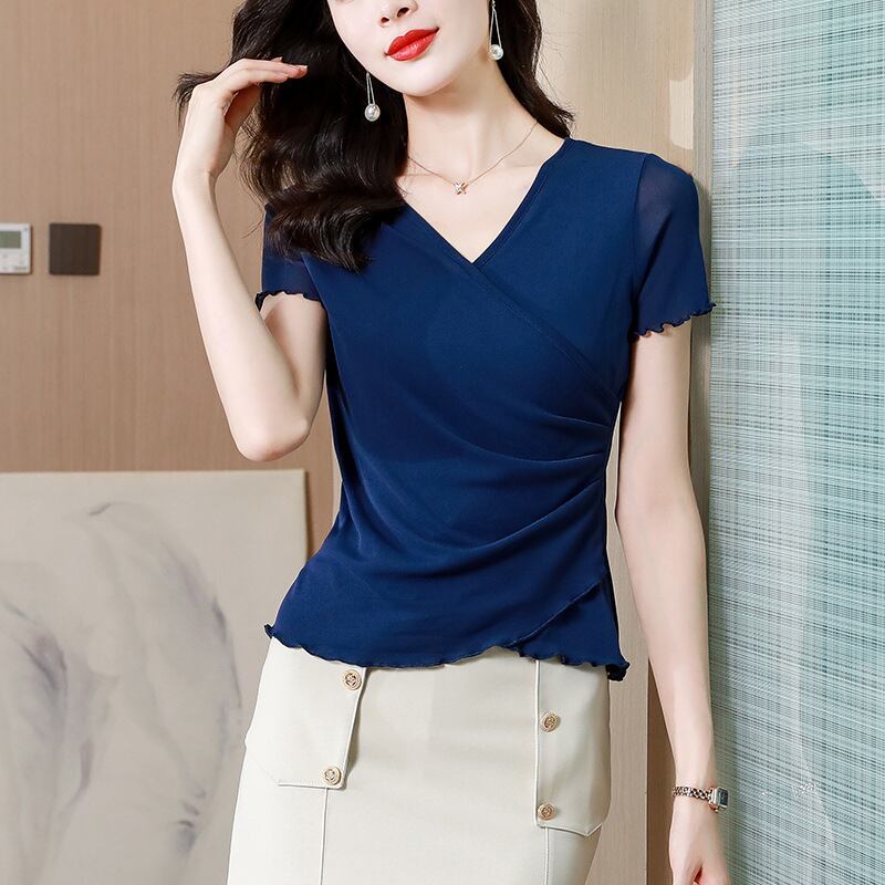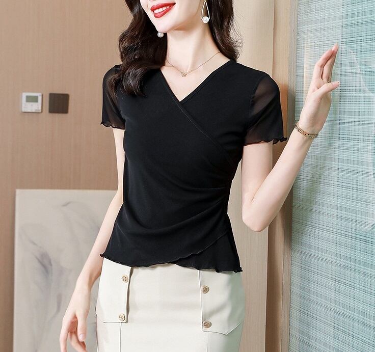ウエスト細見え メロウフリル カシュクール シアー トップス ブラウス プルオーバー ミディアム 半袖 Vネック カシュクール 襟なし スリム 細身 フェミニン 透け感 シースルー メローフリル シアー かわいい 大人可愛い きれいめ シンプル カジュアル 上品 おしゃれ こなれ感 エレガント 無地 春 夏 秋 ママ 通勤 学生 学校 通学 デート お出かけ 旅行 公園 女子会 休日 ショッピング カフェ 普段使い 着回し M L XL 2XL 3XL 大きいサイズ 黒 ブラック ブルー