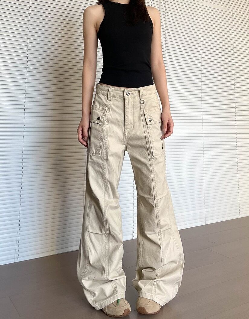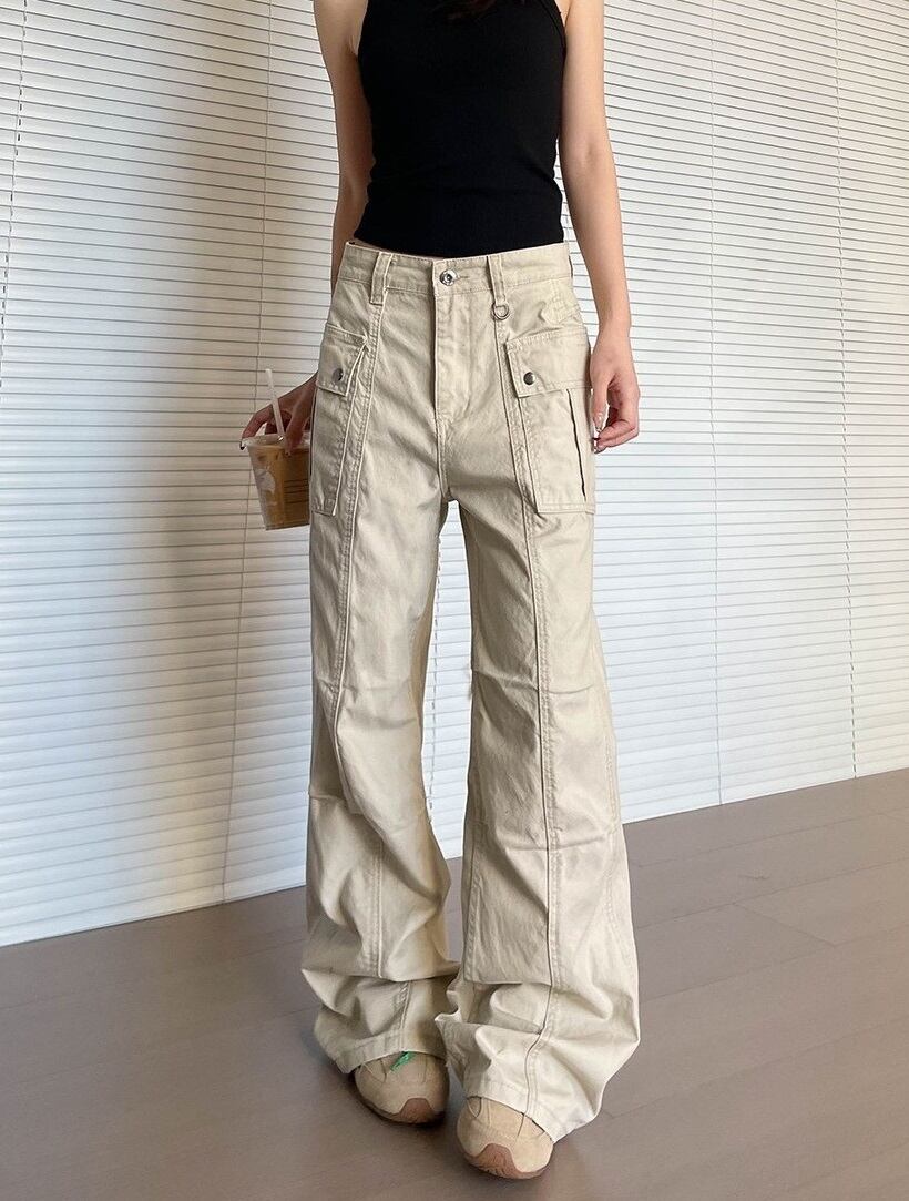 ハイウエスト ロング丈 カーゴパンツ レディース パンツ ボトムス ロングパンツ ロング ワイド ストリート ファスナー ポケット ボタン ジッパー チャック かわいい 大人可愛い シンプル カジュアル おしゃれ かっこいい こなれ感 メンズライク ボーイッシュ ルーズ クール 無地 春 夏 秋 冬 ママ 通勤 学生 学校 通学 デート お出かけ 旅行 公園 女子会 休日 ショッピング カフェ 体型カバー 脚長 S M L XL 2XL 3XL 大きいサイズ ゆったり グレー アプリコット