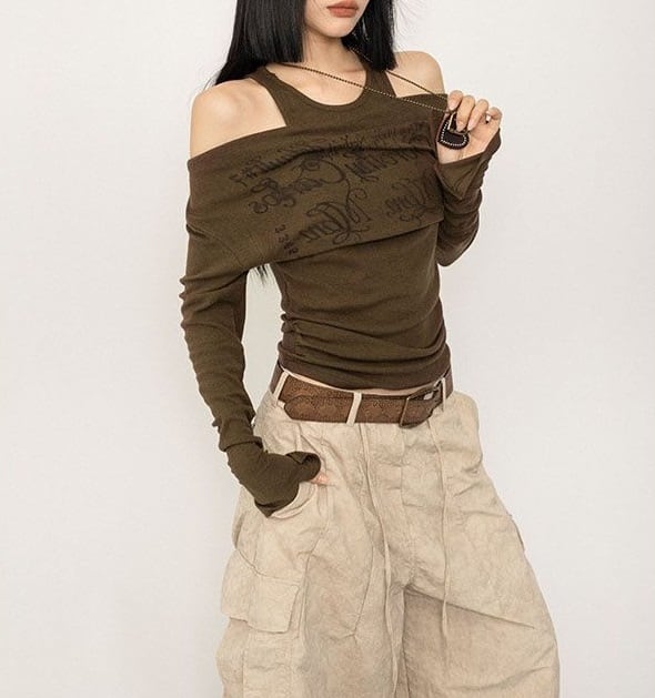 重ね着風 オフショルダー ロンT レディース トップス カットソー プルオーバー レイヤード風 ミディアム 長袖 ラウンドネック オフショルダー 襟なし ケープ風 スリム 細身 切り替え ドッキング ストリート かわいい 大人可愛い カジュアル おしゃれ かっこいい こなれ感 ボーイッシュ 個性的 存在感 プリント ロゴ 英字 春 秋 ママ 通勤 学生 学校 通学 デート お出かけ 旅行 公園 女子会 休日 ショッピング カフェ 普段使い 着回し M L XL グレー アプリコット コーヒーブラウン