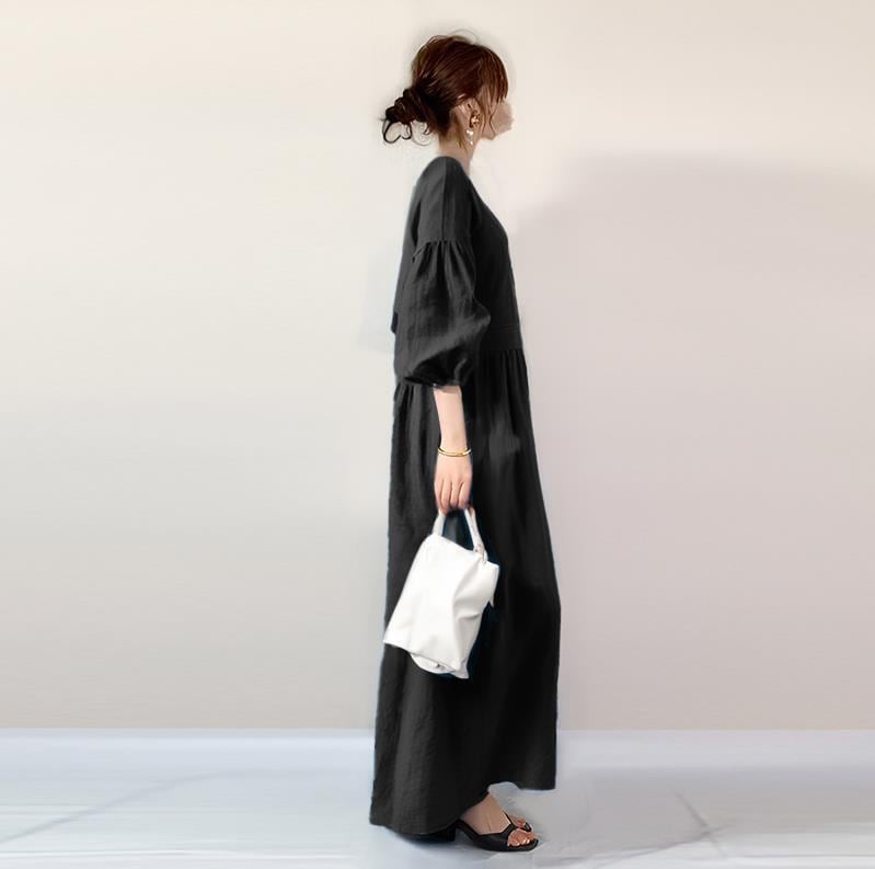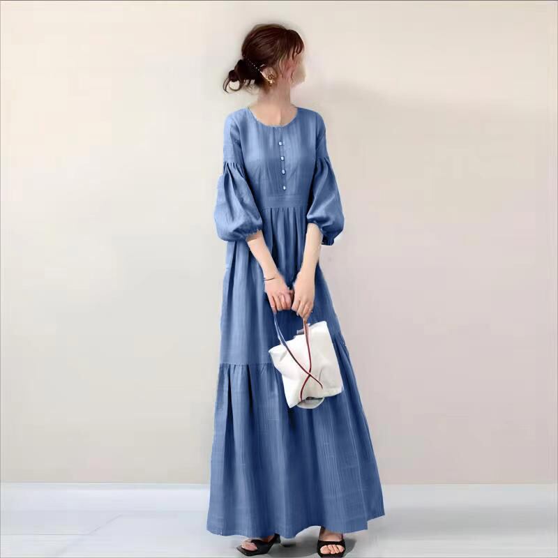パフスリーブ ロング丈 ティアードワンピース レディース ワンピース サマーワンピ 膝下 ロング マキシ 半袖 7分袖 ラウンドネック 襟なし フレア Aライン 切り替え ティアード フェミニン ハイウエスト ボタン 切り替えデザイン かわいい 大人可愛い シンプル カジュアル おしゃれ こなれ感 ルーズ 無地 春 夏 秋 ママ 通勤 学生 学校 通学 デート お出かけ 旅行 公園 女子会 休日 ショッピング カフェ 楽ちん 体型カバー 脚長 普段使い 着回し S M L ゆったり 黒 ブラック ブルー
