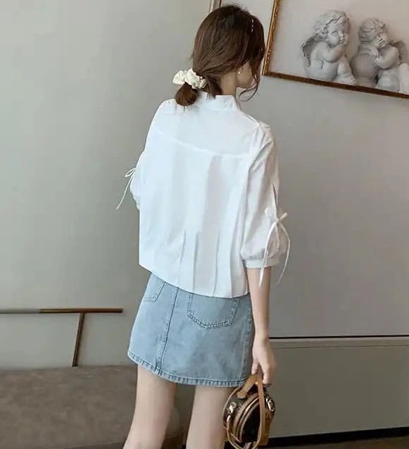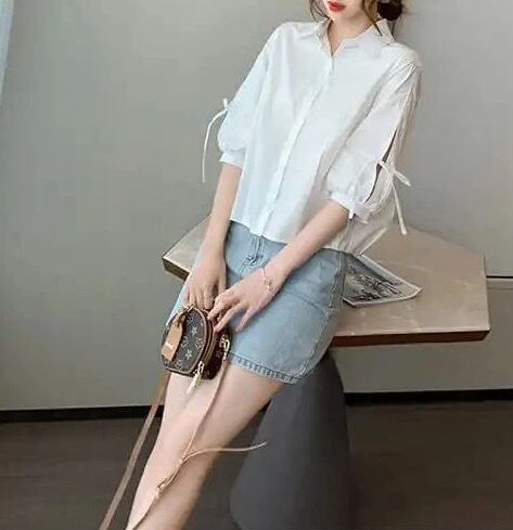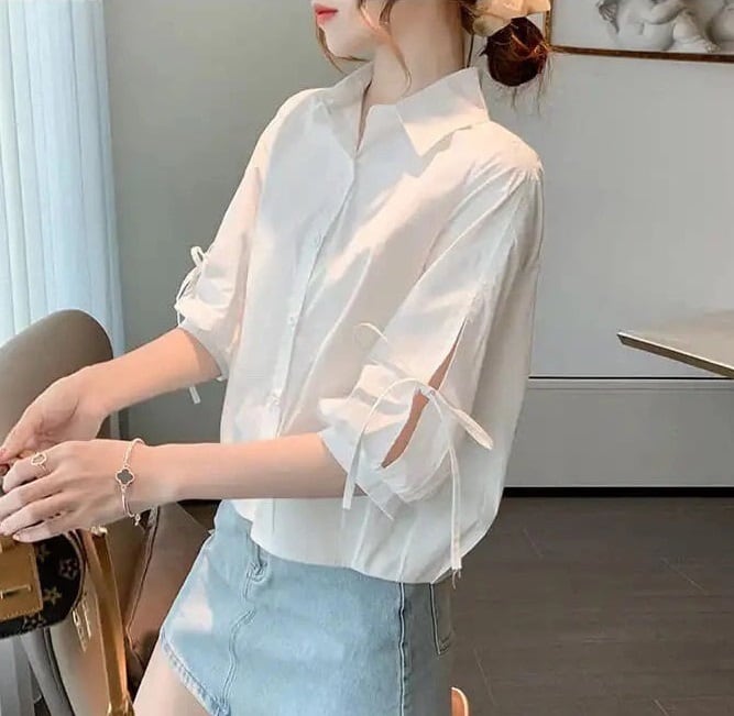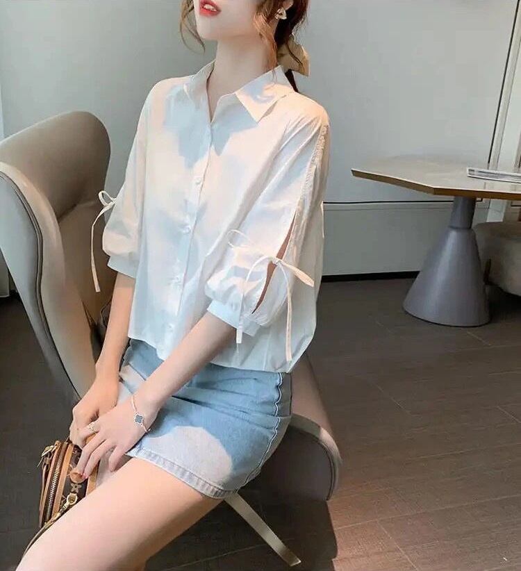 このシャツは、5分袖と可愛いリボン付きのデザインが特徴で、シンプルながらもおしゃれな印象を与えます。角襟デザインと前開きボタンが、気軽に着こなせるポイントです。カジュアルからきれいめまで幅広く対応でき、通勤やデート、お出かけにもぴったり!春夏秋のシーズンで活躍する万能アイテムです♪