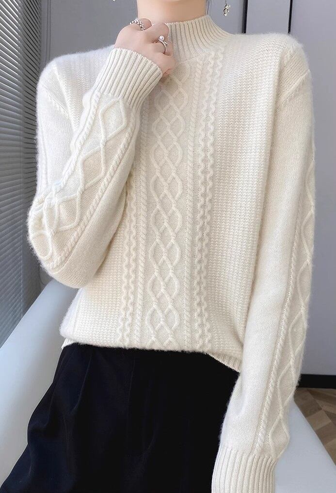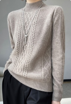 大人可愛いスタイルを演出する「半ハイネック ケーブル編み ニットセーター」のご案内です!