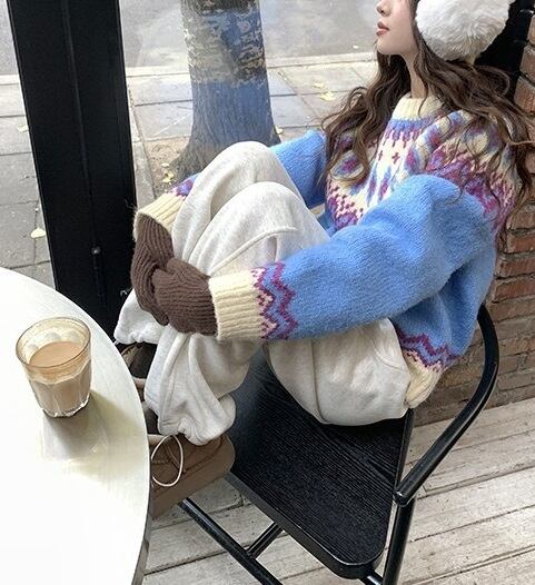 ラウンドネック 長袖 ニットセーター レディース トップス ニット セーター プルオーバー ミディアム 長袖 ラウンドネック 襟なし リブ 伸縮性 配色 かわいい 大人可愛い カジュアル おしゃれ レトロ こなれ感 個性的 主役級 存在感 柄 春 秋 冬 ママ 通勤 学生 学校 通学 デート お出かけ 旅行 公園 女子会 休日 ショッピング カフェ 重ね着 暖かい 体型カバー 普段使い 着回し レイヤード ゆったり フリーサイズ ピンク スカイブルー
