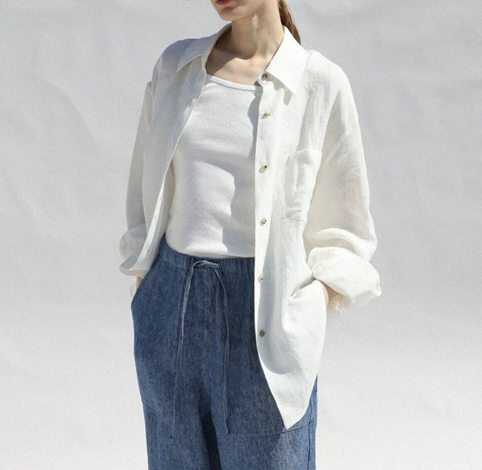 このオーバーサイズ 襟付き 長袖 シャツは、シンプルでありながら上品さを兼ね備えたアイテム♪ ドロップショルダーや角襟デザインが特徴で、カジュアルからきれいめまで幅広いシーンで活躍します。前開きボタンスタイルとポケット付きで、普段使いや通勤、デート、お出かけなど多様なシーンでおしゃれを楽しめる一着です。リネンやコットン素材を使用しており、軽やかな着心地で体型カバーにも最適です。