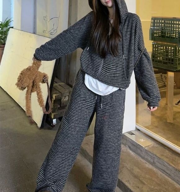 このアイテムは、春から冬まで大活躍するルームウェアで、家でのリラックスタイムや、ちょっとしたお出かけにぴったりの組み合わせです。ドロップショルダーのフードパーカーは、ゆったりとしたシルエットが魅力的で、カジュアルさを演出します。そして、ハイウエストのロングパンツは体型カバーに優れ、スリムな印象を与えます。前開きのジップアップデザインなので、着脱も簡単!ボーダー柄がシンプルながらもおしゃれ感をプラスし、普段使いからデート、お泊まり、旅行など、幅広いシーンで活躍します!