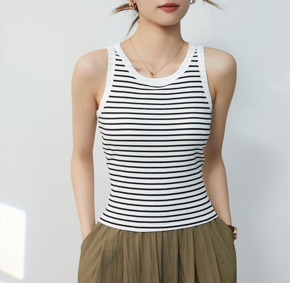 大人可愛い「パッド一体型 ボーダー柄 ラウンドネック タンクトップ」で、シンプルな中にもおしゃれを楽しみましょう!伸縮性に優れた綿素材を使用しており、着心地も抜群。ノースリーブデザインは、カジュアルさときれいめ感を兼ね備え、さまざまなシーンで活躍します。春夏秋冬問わず、普段使いや旅行、通勤やデートにもぴったりのアイテムです!