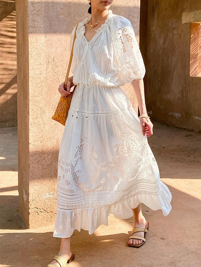 セットアップ 透かし編み レース ブラウス ロングスカート 2点セット 上下セット レディース スカート トップス ボトムス フレアスカート レーススカート ロング マキシ 半袖 5分袖 パフスリーブ Vネック Aライン 切り替え フェミニン ハイウエスト 編み上げ 透け感 かわいい 大人可愛い きれいめ シンプル カジュアル 上品 おしゃれ レトロ 花柄 フラワー 春 夏 秋 ママ 通勤 学生 学校 通学 デート お出かけ リゾート 旅行 公園 女子会 休日 普段使い 着回し S M L 白 ホワイト