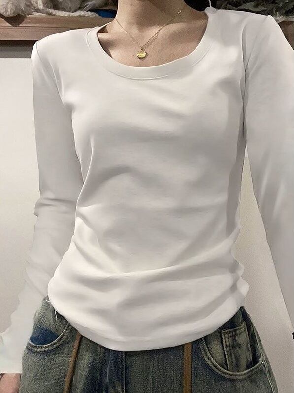 このロンTは、細身のシルエットが特徴で、カジュアルにもきれいめにも合わせやすいデザインです。襟のないラウンドネックが首回りをすっきりと見せ、上品な印象を与えます!春、秋、冬とシーズンを問わず、普段使いや重ね着にぴったりで、通勤や学校、デート、お出かけなど、幅広いシーンで活躍するアイテムです。