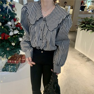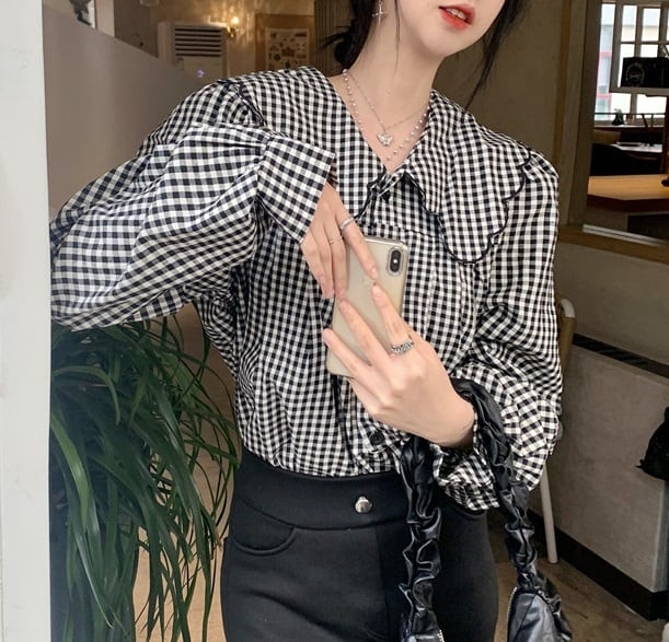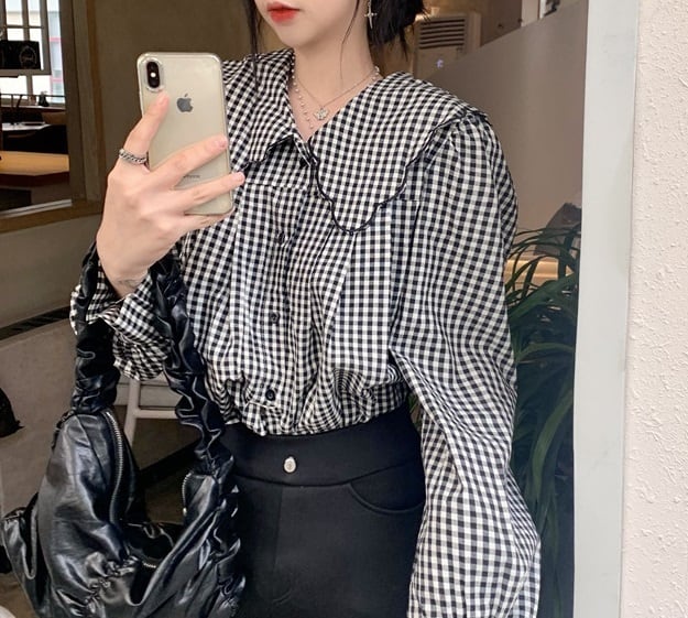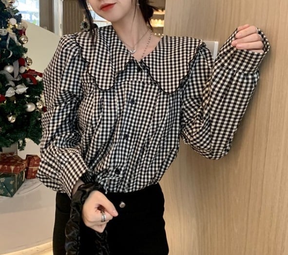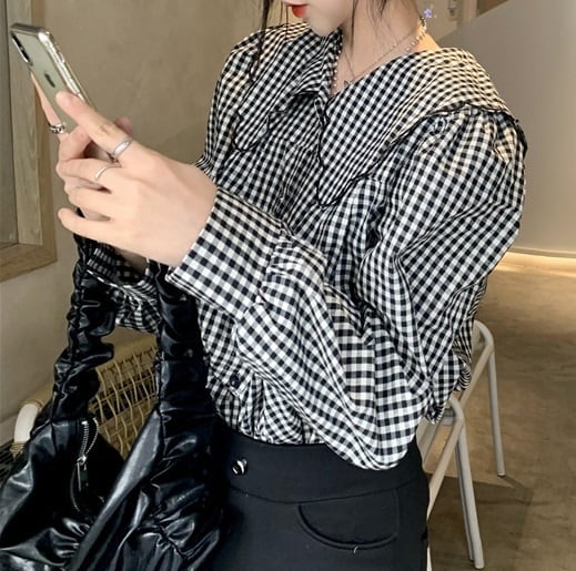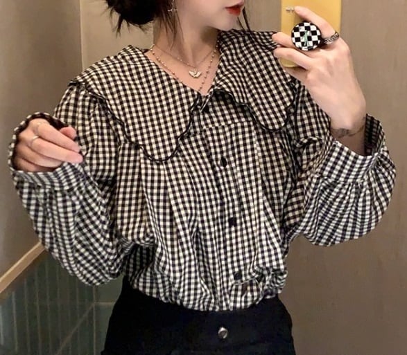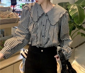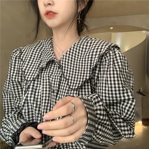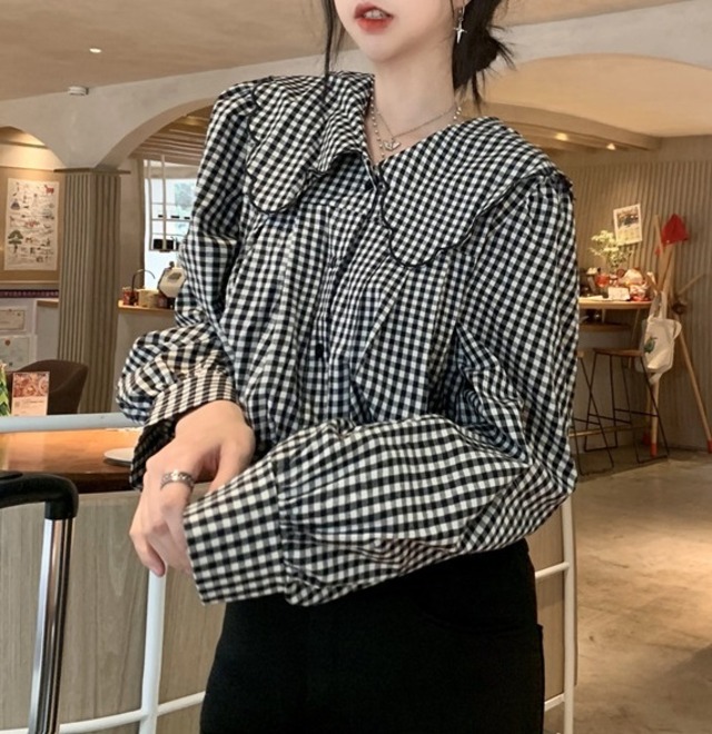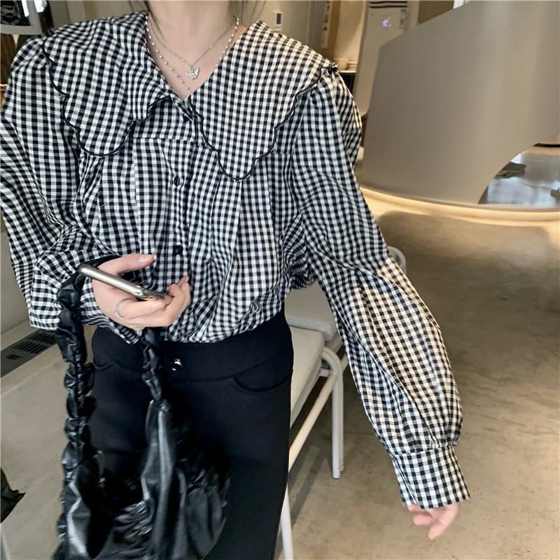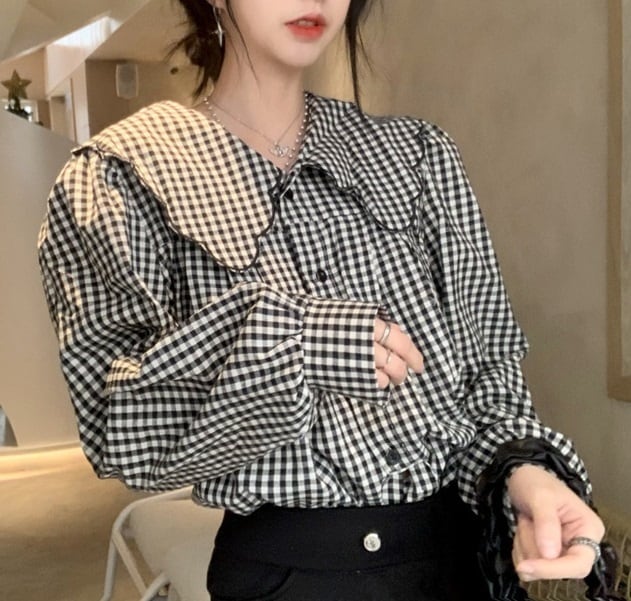 大きめ襟 チェック柄 長袖 シャツ ブラウス レディース トップス 羽織 ミディアム 長袖 パフスリーブ 襟付き 丸襟 フェミニン 前開き ボタン スカラップ かわいい 大人可愛い シンプル カジュアル おしゃれ こなれ感 ガーリー 個性的 主役級 存在感 チェック 格子柄 ギンガムチェック 春 秋 冬 ママ 通勤 学生 学校 通学 デート お出かけ 旅行 公園 女子会 休日 ショッピング カフェ 重ね着 体型カバー 普段使い 着回し レイヤード M ゆったり フリーサイズ チェック柄