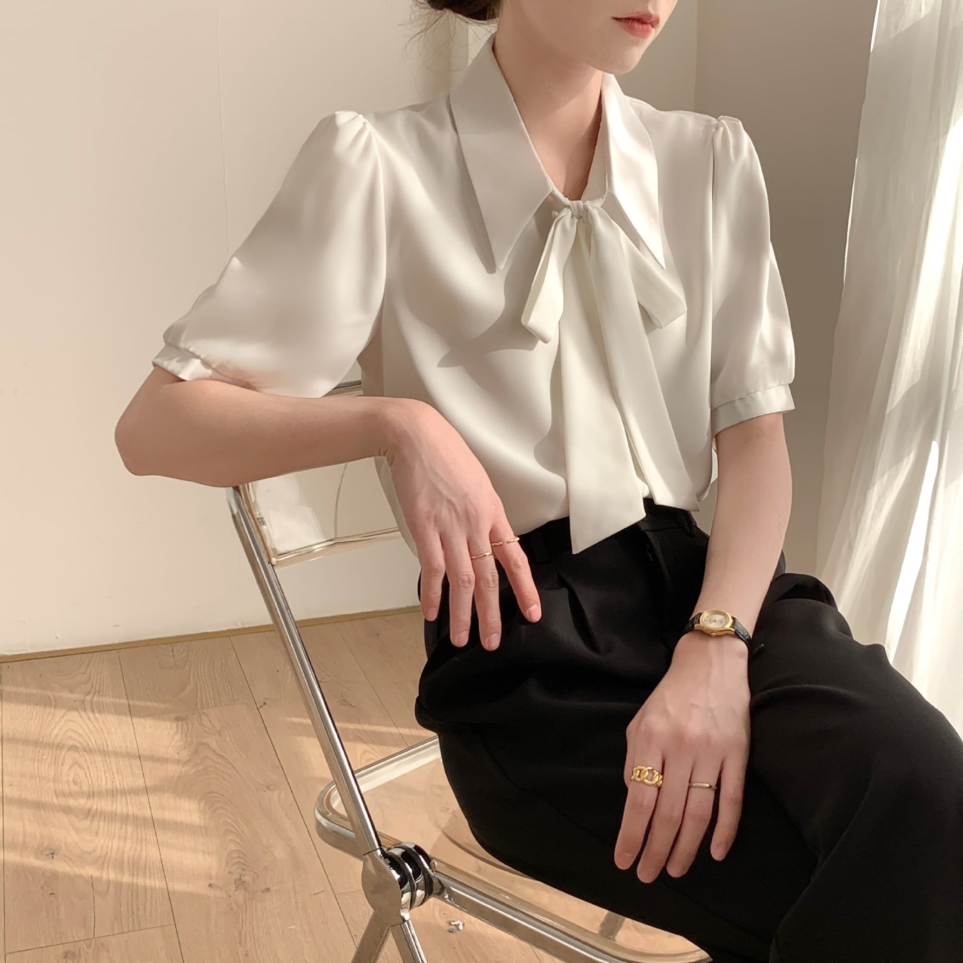 2タイプ ボウタイリボン 角襟 長袖 半袖 シャツ レディース トップス ブラウス インナー ミディアム パフスリーブ 襟付き ボウタイ りぼんタイ リボン 前開き ボタン かわいい 大人可愛い きれいめ シンプル カジュアル 上品 おしゃれ ガーリー 個性的 主役級 存在感 フォーマル 無地 春 夏 秋 冬 授業参観 会議 ミーティング ママ オフィス OL 通勤 学生 学校 通学 デート お出かけ 旅行 公園 女子会 休日 普段使い 着回し S M L XL ゆったり 白 ホワイト ピンク ブルー