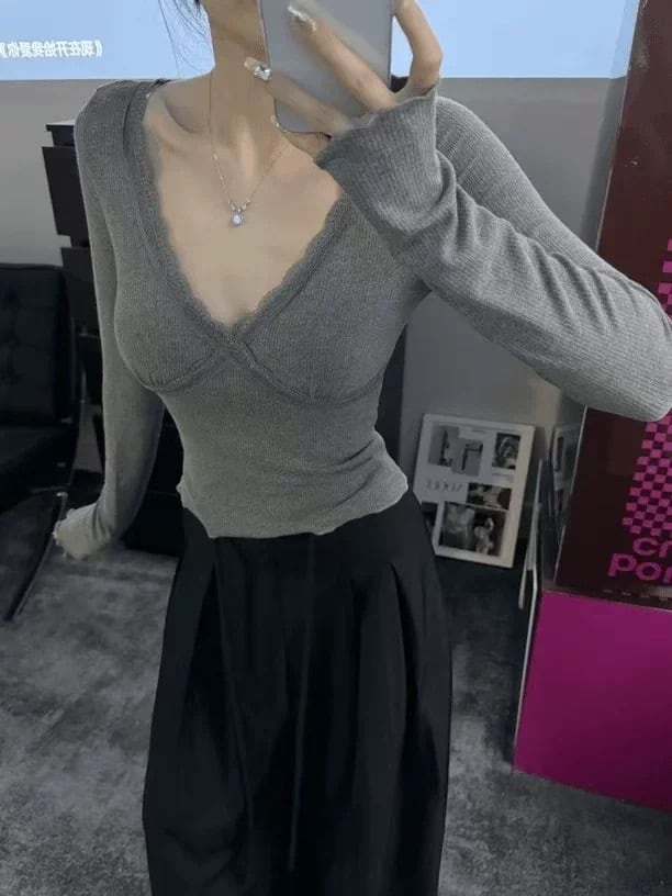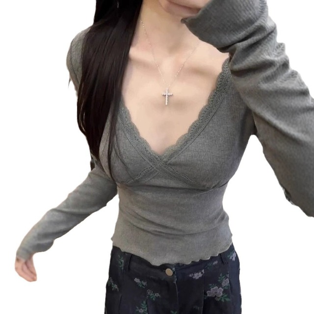 このニットセーターは、繊細なレースと深Vネックが特徴で、女性らしさを引き立てるデザインになっています。メロウフリルが施された長袖スタイルは、シンプルながらも可愛らしく、カジュアルからきれいめまで幅広いシーンで活躍します。スリムなシルエットが体のラインを美しく演出し、大人可愛いコーディネートにぴったりです。通勤、デート、お出かけ、女子会など、様々な場面での着回しができるアイテムです!