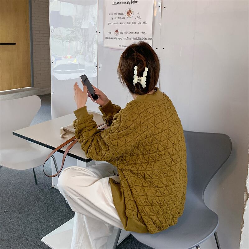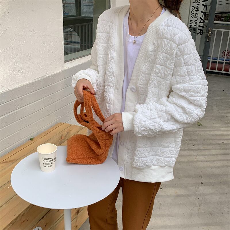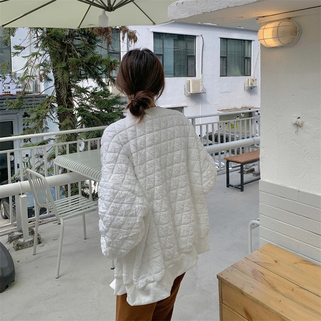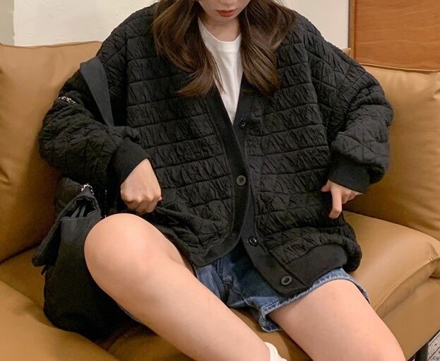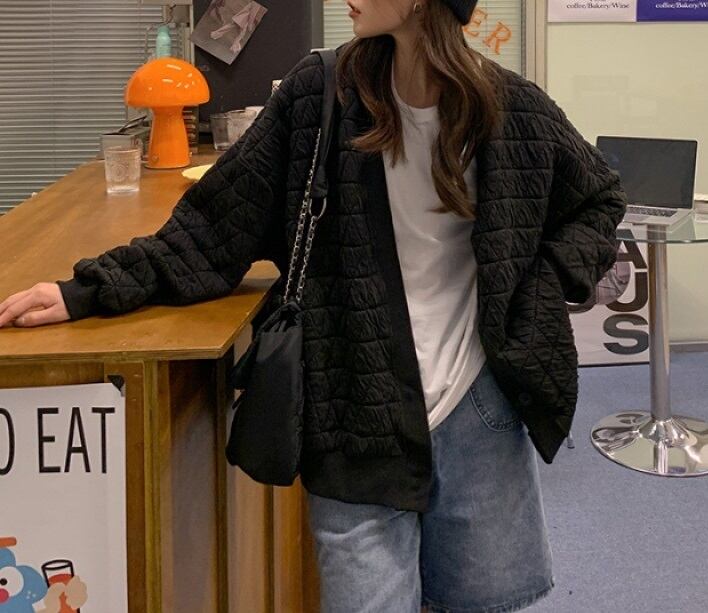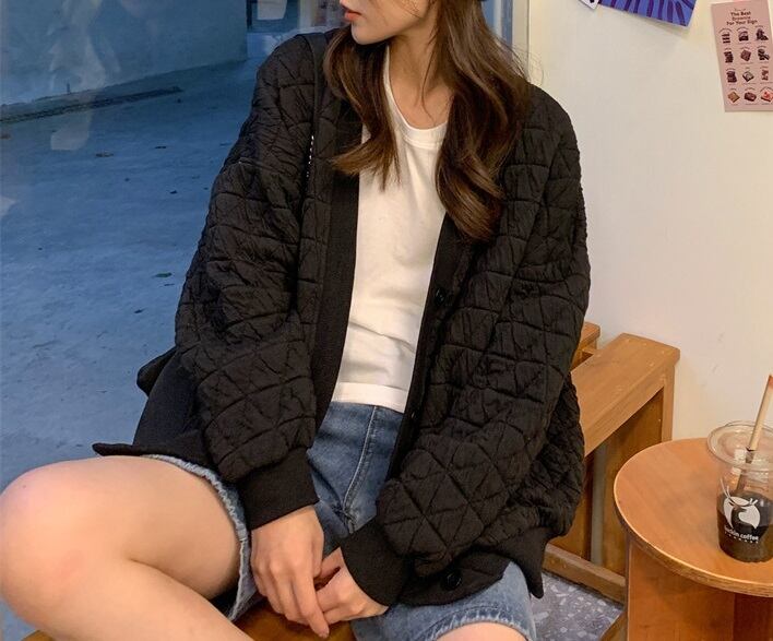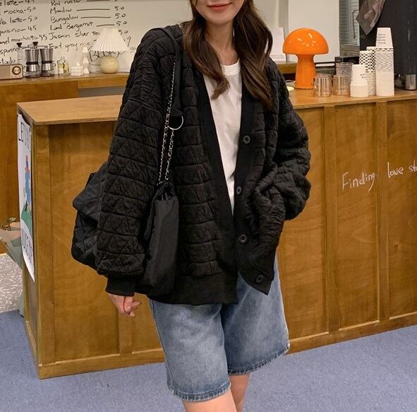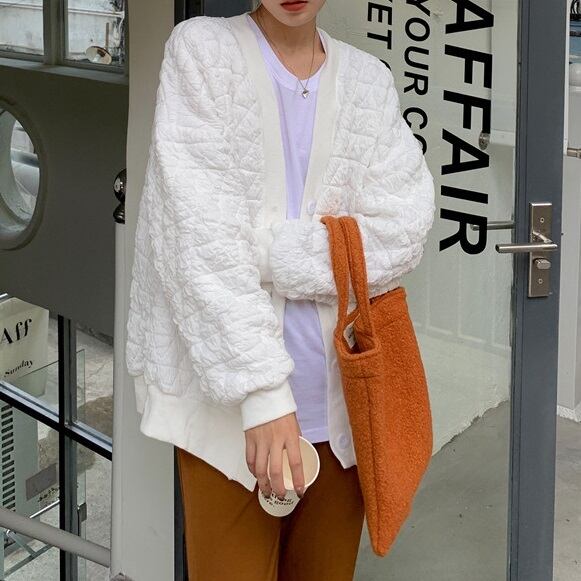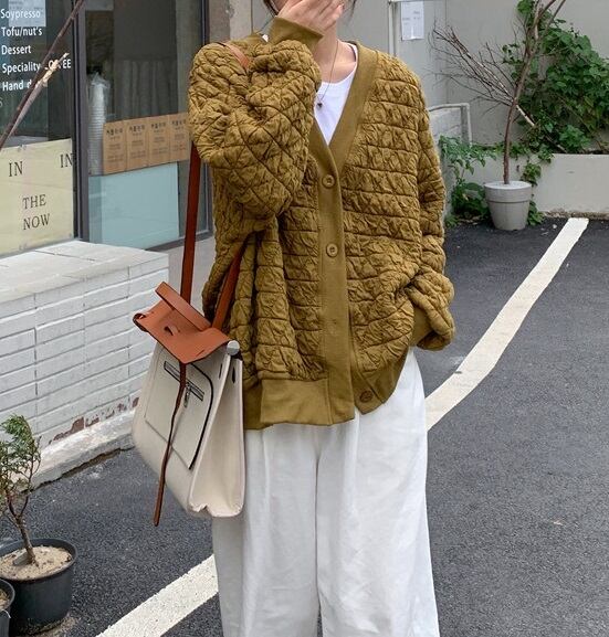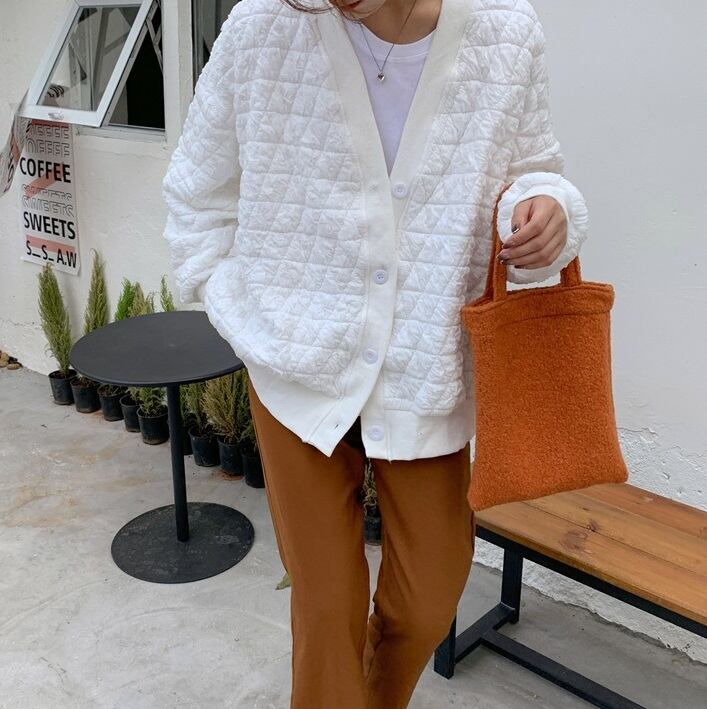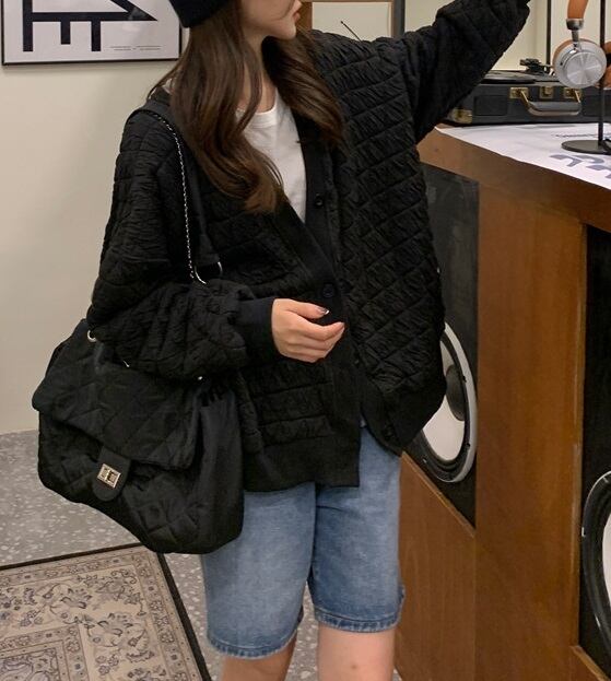 このVネックキルティング長袖カーディガンは、柔らかな素材感とあたたかさが魅力的。襟なしデザインとドロップショルダーは、リラックスした雰囲気を演出しつつ、大人可愛い印象を与えます。普段使いからデート、お出かけ、通勤や学校シーンでも幅広く活躍すること間違いなしです。丈長のミディアムタイプは、体型カバー効果もあり、重ね着にも最適です。可愛い格子の菱柄デザインがシンプルながらおしゃれ感を醸し出します。また、色展開が豊富で、白、黒、マスタードイエローと選びやすいのも嬉しいポイントです。
