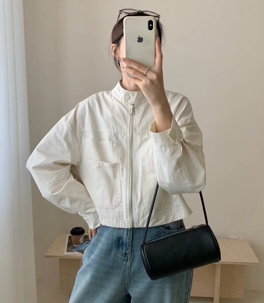 大きめポケット ショート丈 スタンドカラー 長袖 ジャケット レディース トップス アウター 上着 ショート 長袖 ドロップショルダー 襟付き 半ハイネック ファスナー ポケット 前開き ボタン ジップアップ かわいい 大人可愛い シンプル カジュアル おしゃれ かっこいい こなれ感 マニッシュ ルーズ 無地 春 秋 冬 ママ 通勤 学生 学校 通学 デート お出かけ 旅行 公園 女子会 休日 ショッピング カフェ 重ね着 体型カバー 普段使い 着回し M L ゆったり 白 ホワイト カーキ 黒グレー