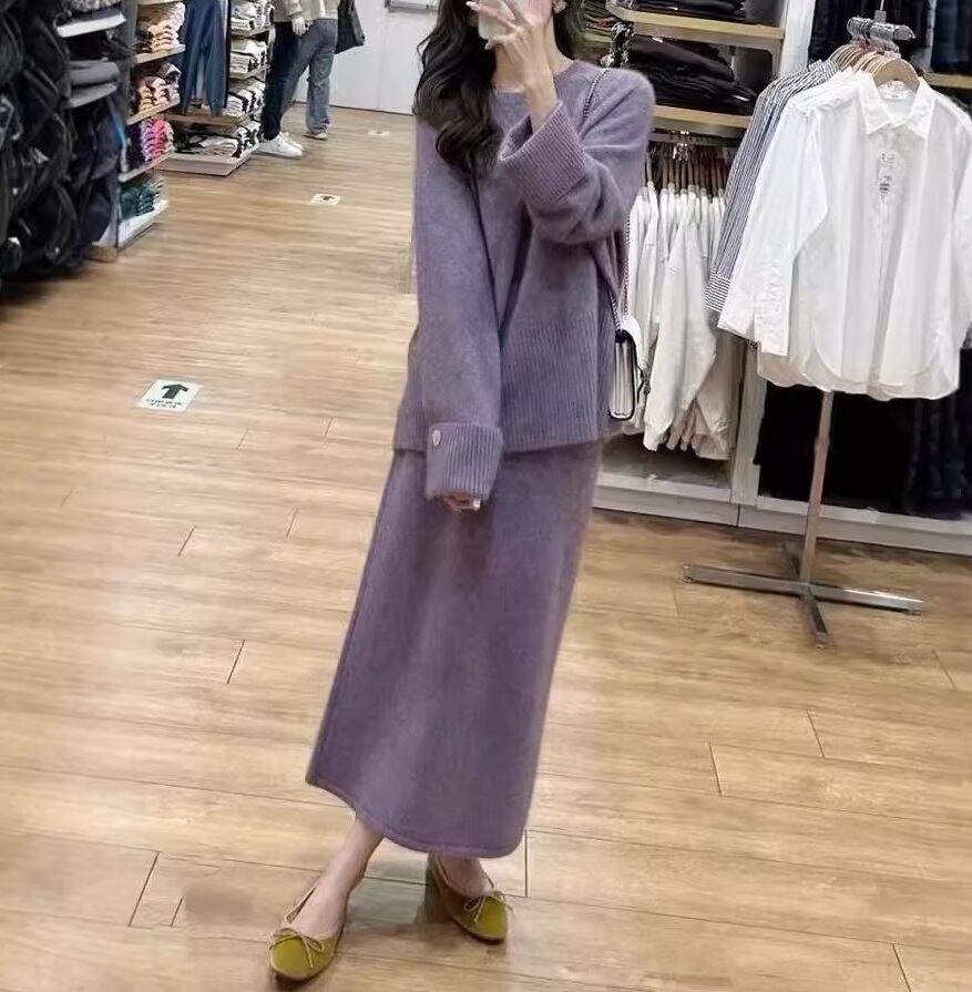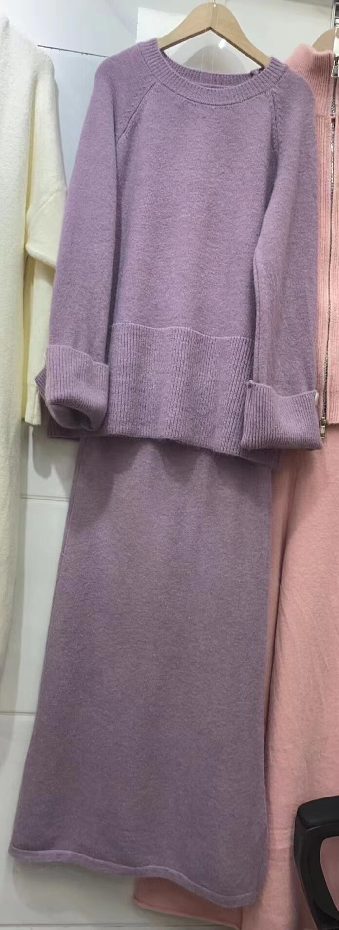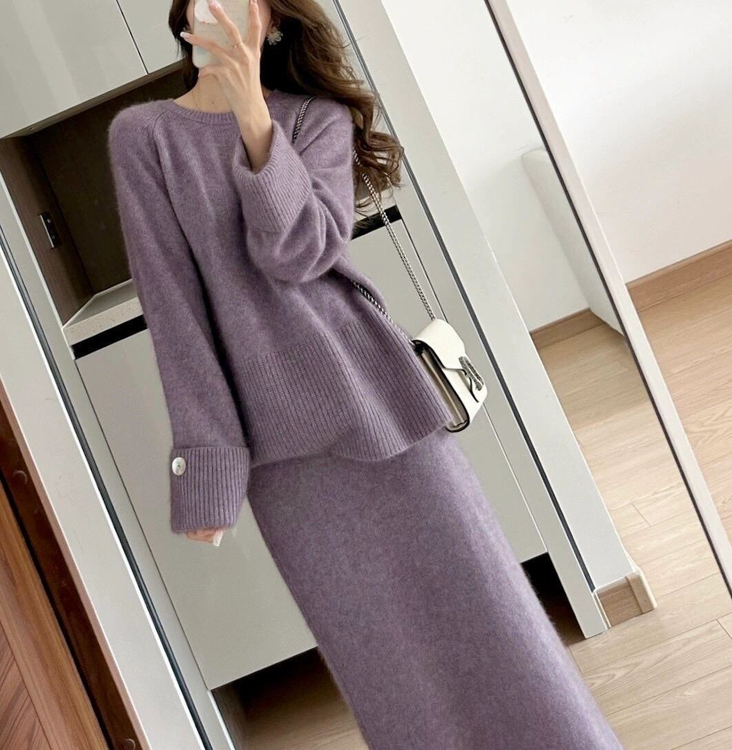 ニット セットアップ ニットセーター ロングスカート 2点セット 上下セット レディース スカート トップス ボトムス セーター プルオーバー ニットスカート ロング マキシ アンクル丈 長袖 ラウンドネック Iライン リブ 切り替えデザイン 袖リブ 裾リブ かわいい 大人可愛い きれいめ シンプル カジュアル おしゃれ こなれ感 ルーズ 無地 春 秋 冬 ママ 通勤 学生 学校 通学 デート お出かけ 旅行 公園 女子会 休日 重ね着 暖かい 普段使い 着回し ゆったり フリーサイズ 紫 パープル