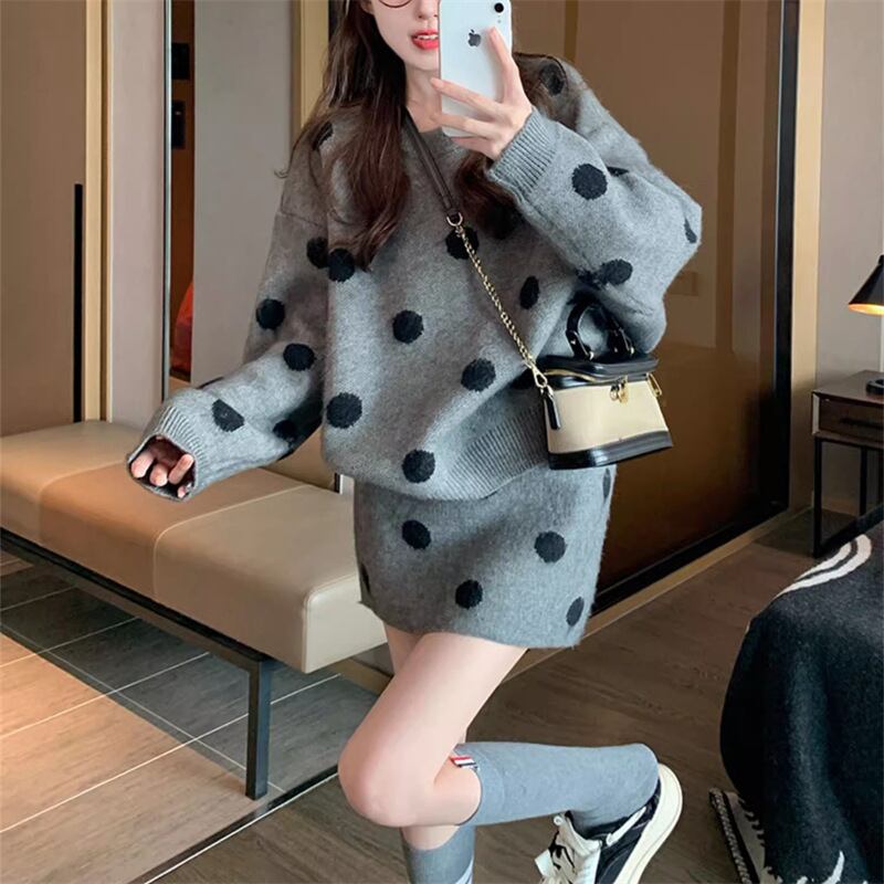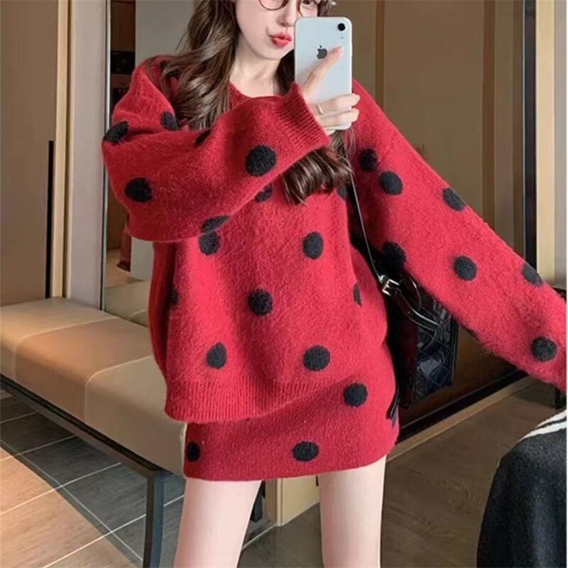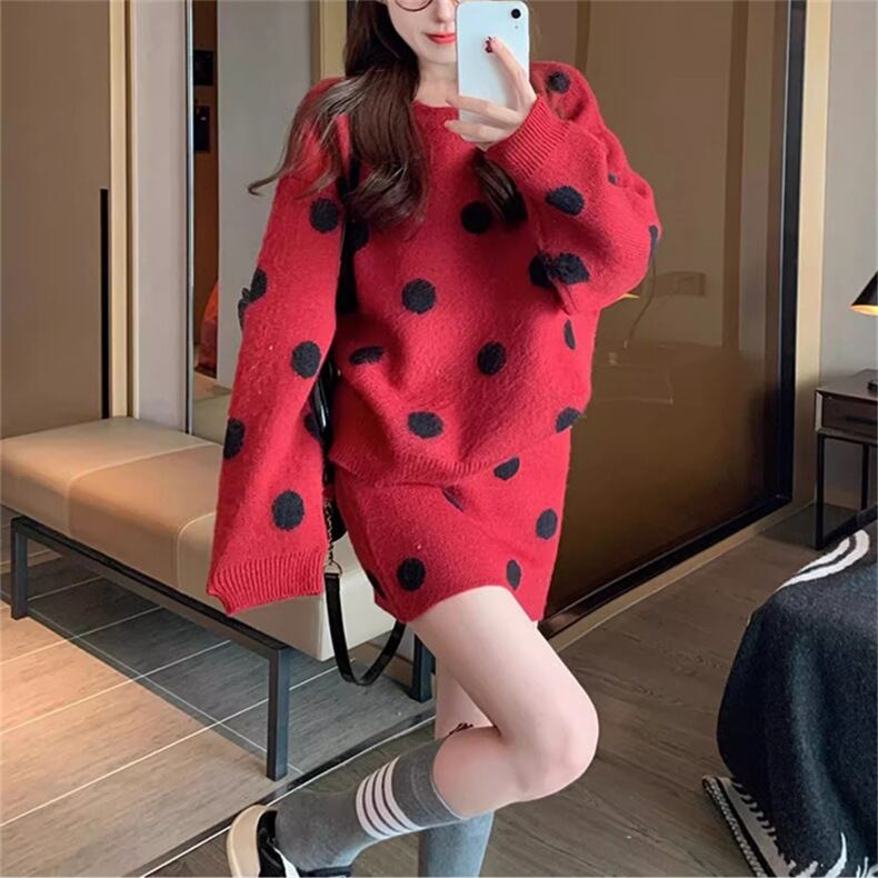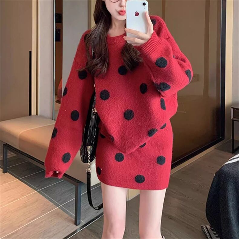 ドット柄 ニット セットアップ ニットセーター ミニスカート 2点セット 上下セット レディース スカート トップス ボトムス セーター プルオーバー ニットスカート ミニ 膝上 長袖 ラウンドネック スリム 細身 オーバーサイズ ふわふわ ハイウエスト かわいい 大人可愛い カジュアル おしゃれ レトロ ガーリー 個性的 水玉 ポルカドット 春 秋 冬 ママ 通勤 学生 学校 通学 デート お出かけ 旅行 公園 女子会 休日 暖かい 普段使い 着回し ゆったり フリーサイズ 黒 ブラック グレー レッド