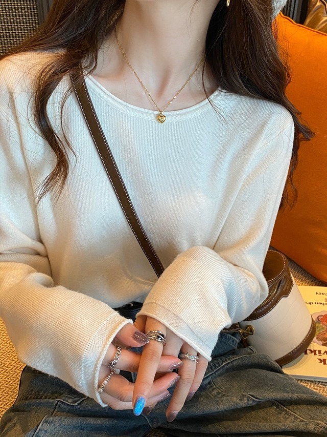 このニットセーターは、ラウンドネックの襟なしデザインで、すっきりとした印象を与えながらも、体型カバー効果があります。ベーシックな無地カラーで、重ね着のレイヤードスタイルにもぴったり!こなれ感を演出し、どんなボトムスとも合わせやすい一枚です。