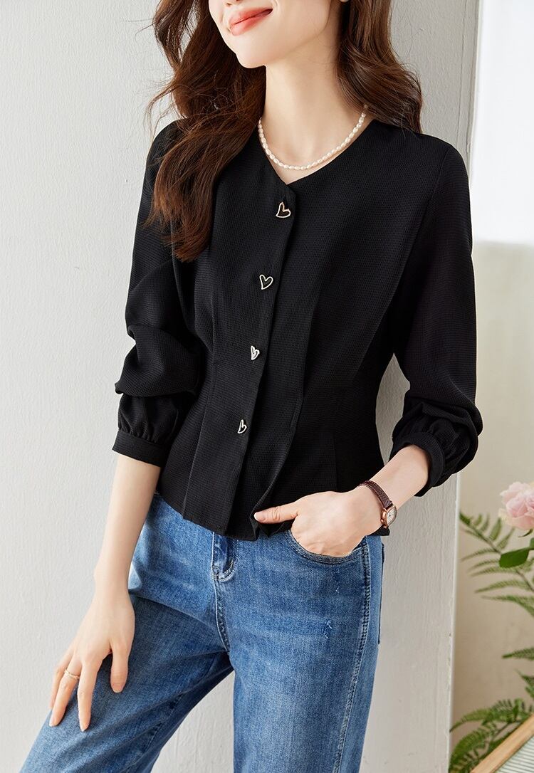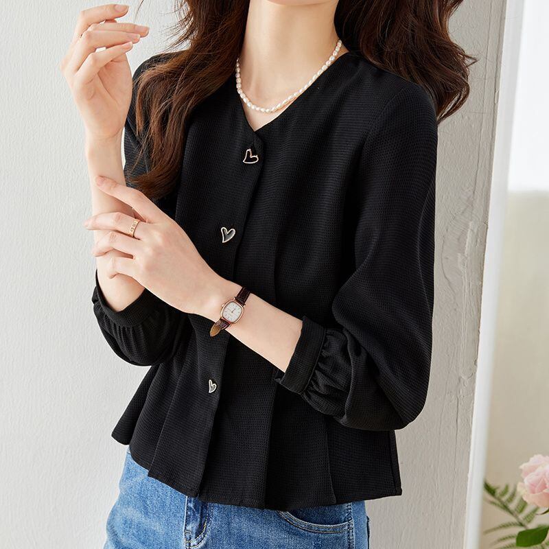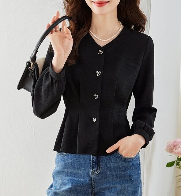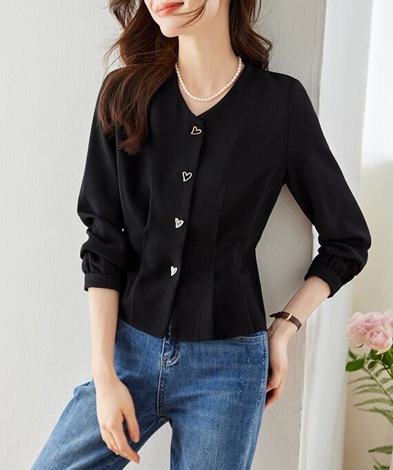 ハートボタン Vネック 長袖 シャツ ブラウス レディース トップス 羽織 ミディアム 長袖 襟なし スリム 細身 ペプラム フェミニン タック タックプリーツ 前開き ウエスト絞り かわいい 大人可愛い きれいめ シンプル カジュアル 上品 おしゃれ ガーリー ラブリー キュート ハート柄 春 秋 冬 ママ 通勤 学生 学校 通学 デート お出かけ 旅行 公園 女子会 休日 ショッピング カフェ 重ね着 体型カバー 普段使い 着回し レイヤード S M L XL 2XL 大きいサイズ 黒 ブラック