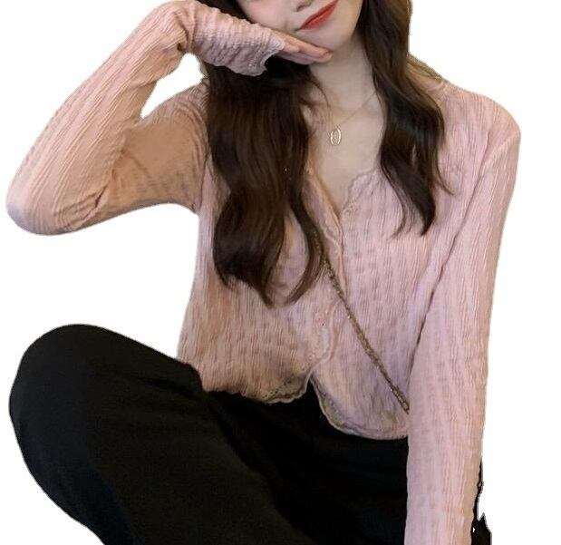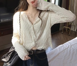 ショート丈 メロウフリル レース 長袖 シャツ ブラウス レディース トップス ショート 長袖 Vネック 襟なし スリム 細身 フェミニン へそ出し レース 前開き ボタン メローフリル かわいい 大人可愛い きれいめ シンプル カジュアル おしゃれ こなれ感 ガーリー ラブリー キュート 無地 エンボス 春 秋 ママ 通勤 学生 学校 通学 デート お出かけ 旅行 公園 女子会 休日 ショッピング 重ね着 韓国 オルチャン 普段使い 着回し フリーサイズ ピンク アプリコット