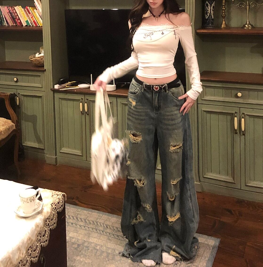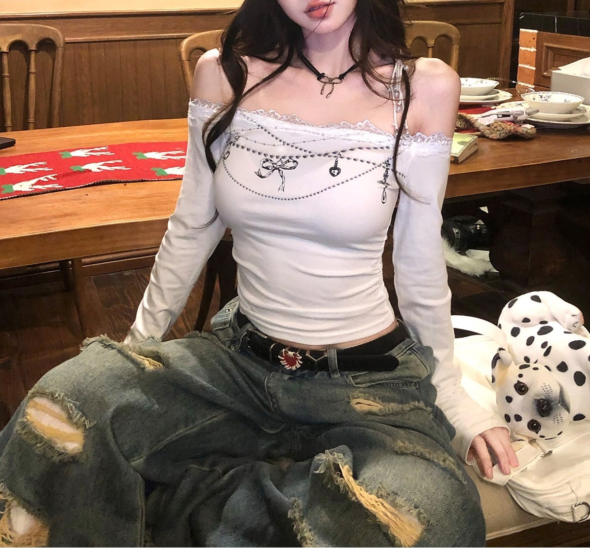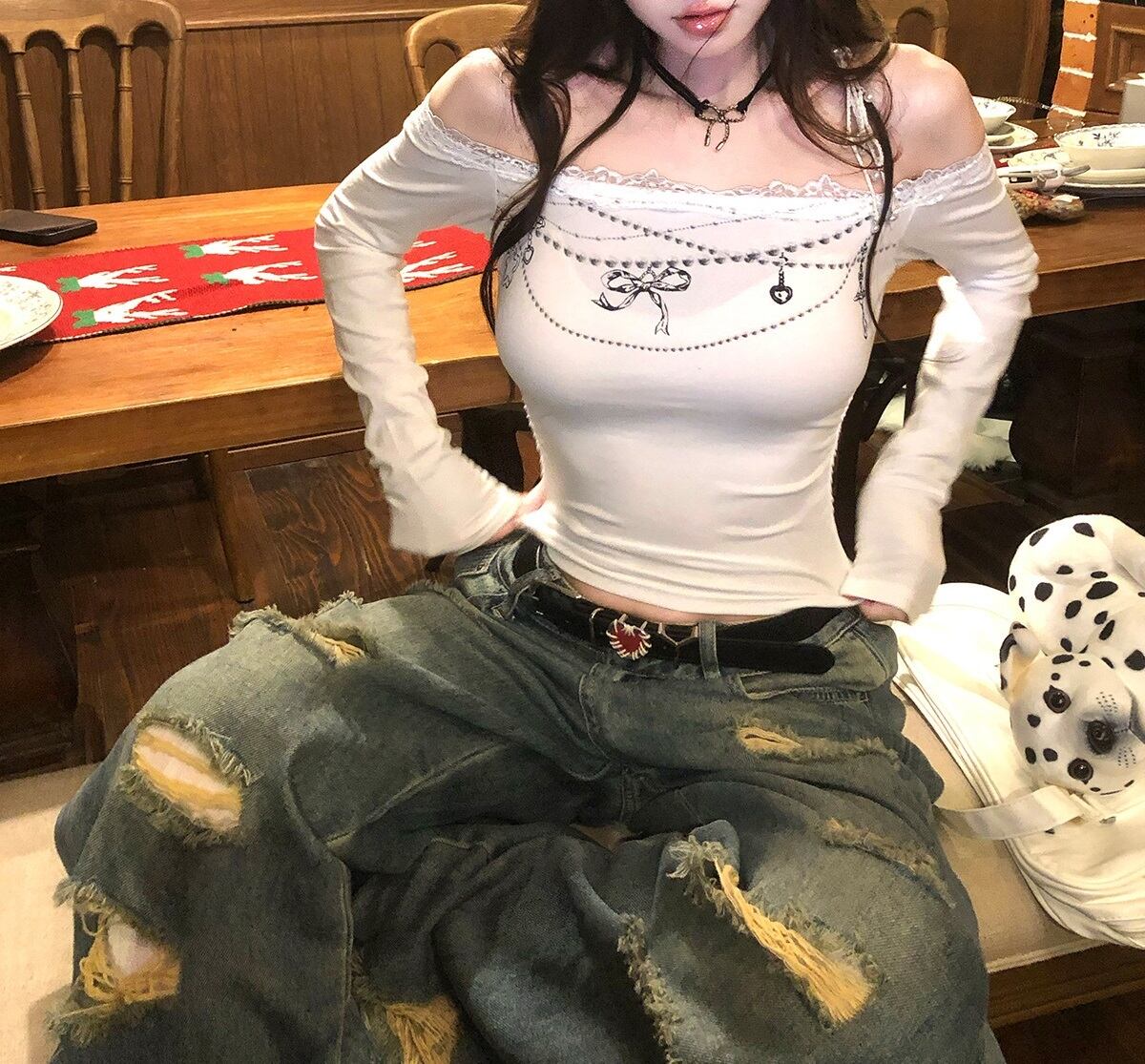 このロンTは、スリムなシルエットでスタイルを美しく見せるだけでなく、へそ出しデザインがトレンド感をプラス。普段使いからデート、お出かけ、女子会まで、幅広いシーンで活躍します。カラーはホワイトで、どんなボトムスとも相性抜群。さまざまなスタイルに着回しが可能で、あなたのワードローブにぴったりな一着になるでしょう!