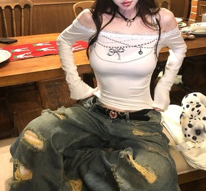 ショート丈 レース付き プリント柄 オフショル 長袖 ロンT レディース トップス カットソー プルオーバー インナー ショート オフショルダー スリム 細身 へそ出し レース かわいい 大人可愛い カジュアル おしゃれ こなれ感 ガーリー 個性的 存在感 プリント 春 秋 ママ 通勤 学生 学校 通学 デート お出かけ 旅行 公園 女子会 休日 ショッピング カフェ 重ね着 普段使い 着回し S M L XL 白 ホワイト