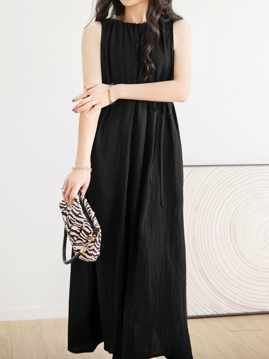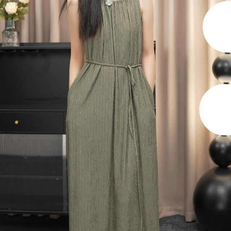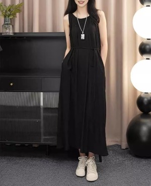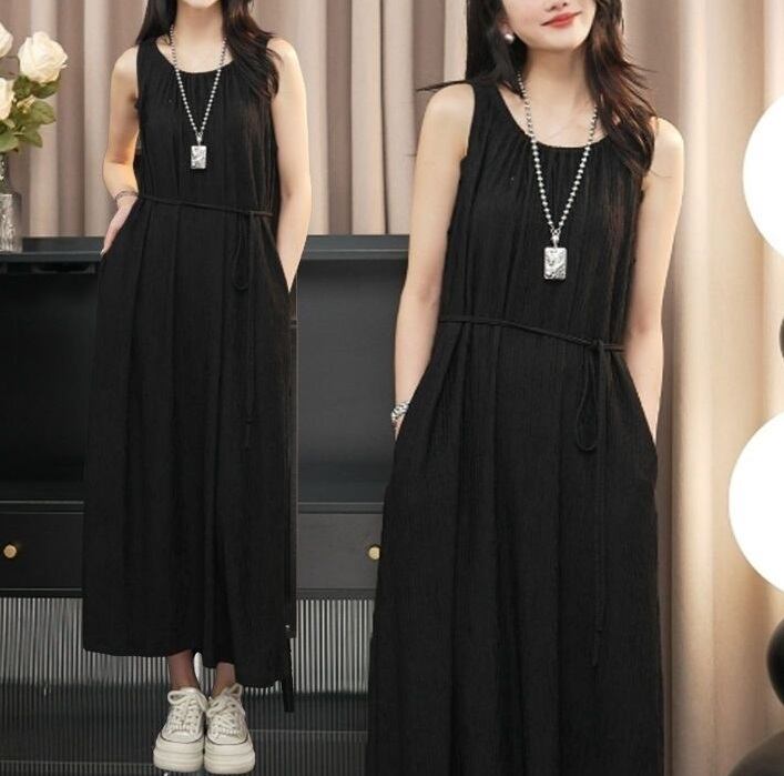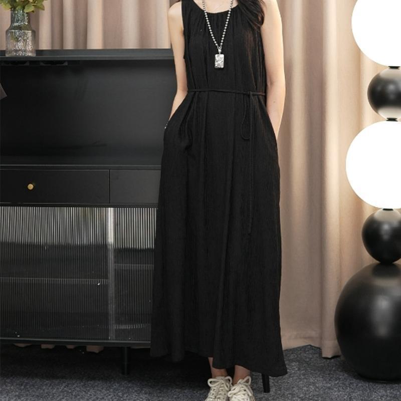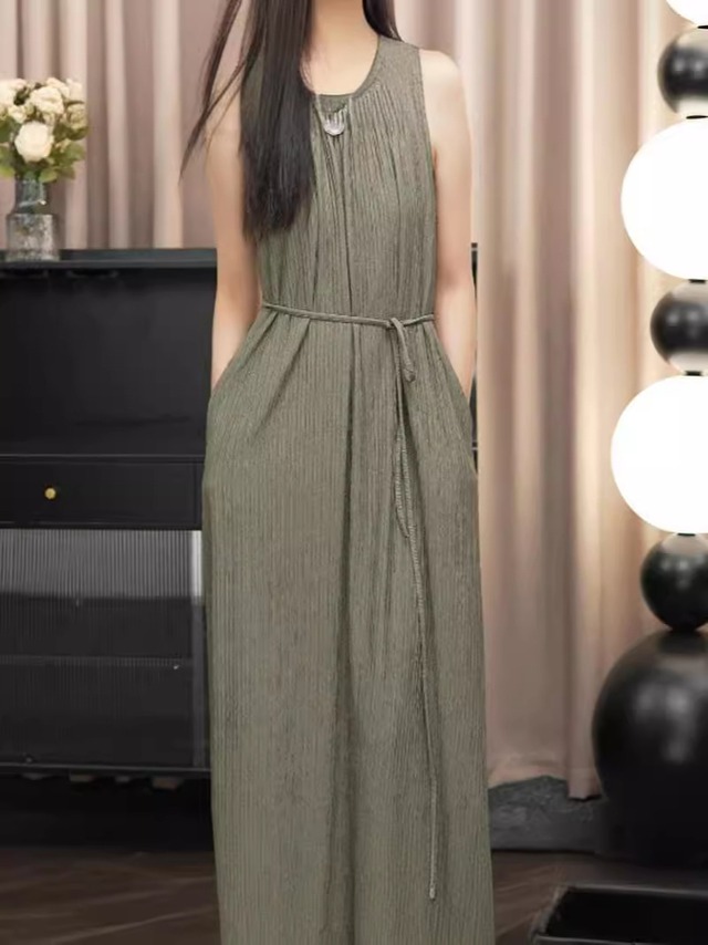 3サイズ 腰ひも付き プリーツ ノースリーブ ロングワンピース レディース ワンピース サマーワンピ 膝下 ロング 丈長 袖なし ラウンドネック 襟なし ドレープ ウエストマーク ポケット ハイウエスト しわ加工 かわいい 大人可愛い きれいめ シンプル カジュアル おしゃれ こなれ感 ラフ ルーズ 無地 春 夏 秋 ママ 通勤 学生 学校 通学 デート お出かけ 旅行 公園 女子会 休日 楽ちん 体型カバー 普段使い 着回し L XL 小さいサイズ 大きいサイズ ゆったり 黒 ブラック ミントグリーン