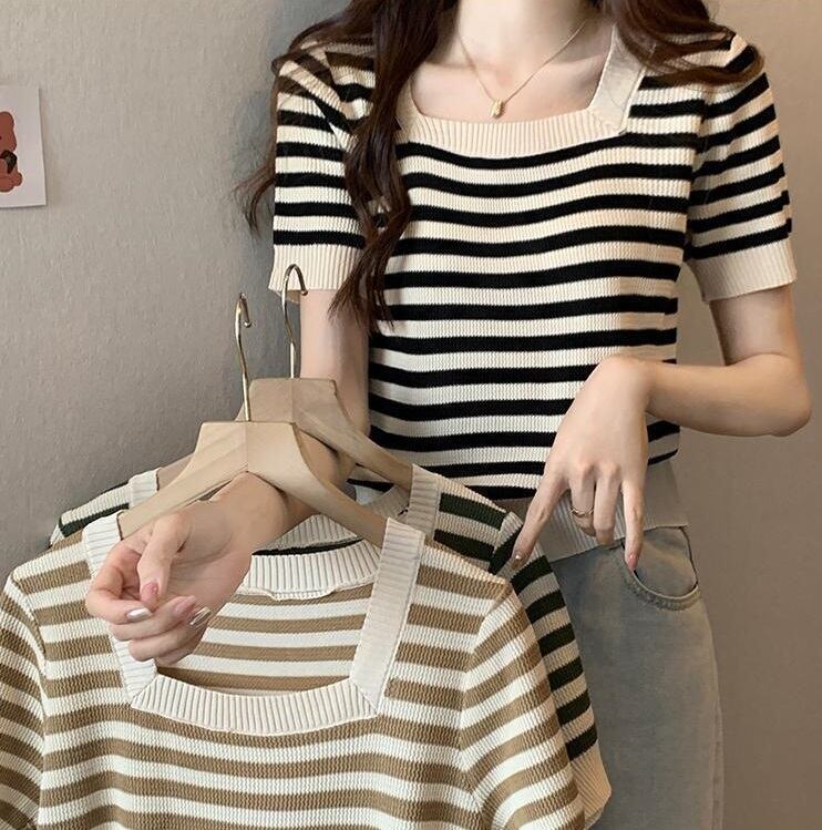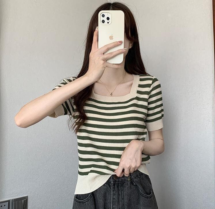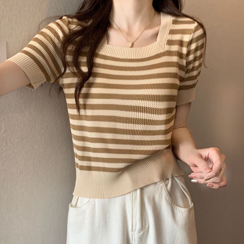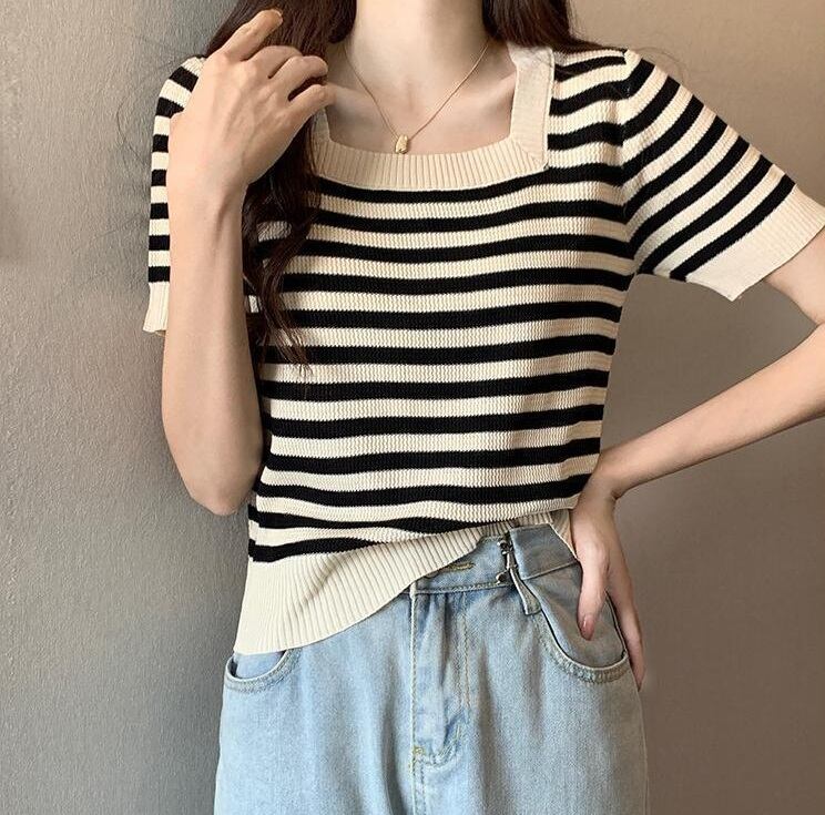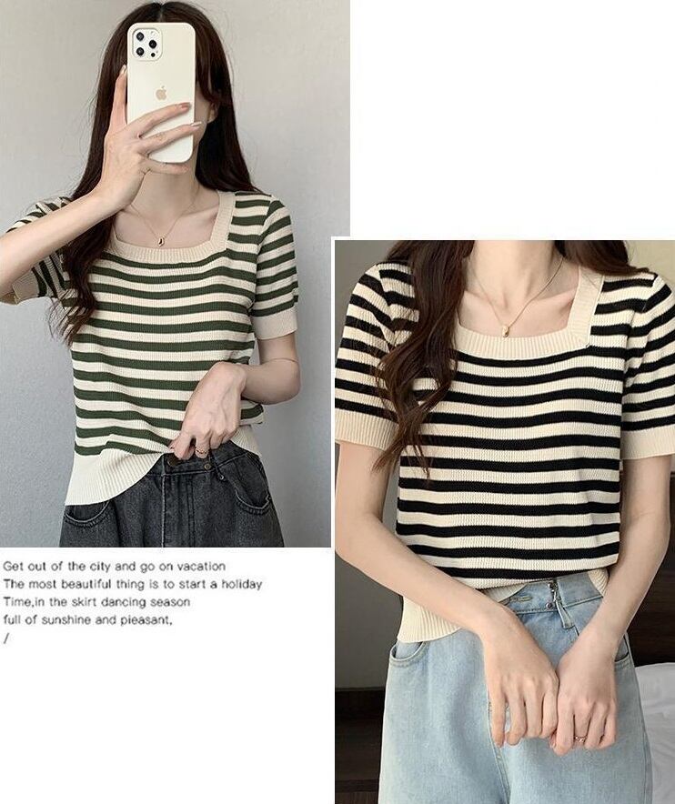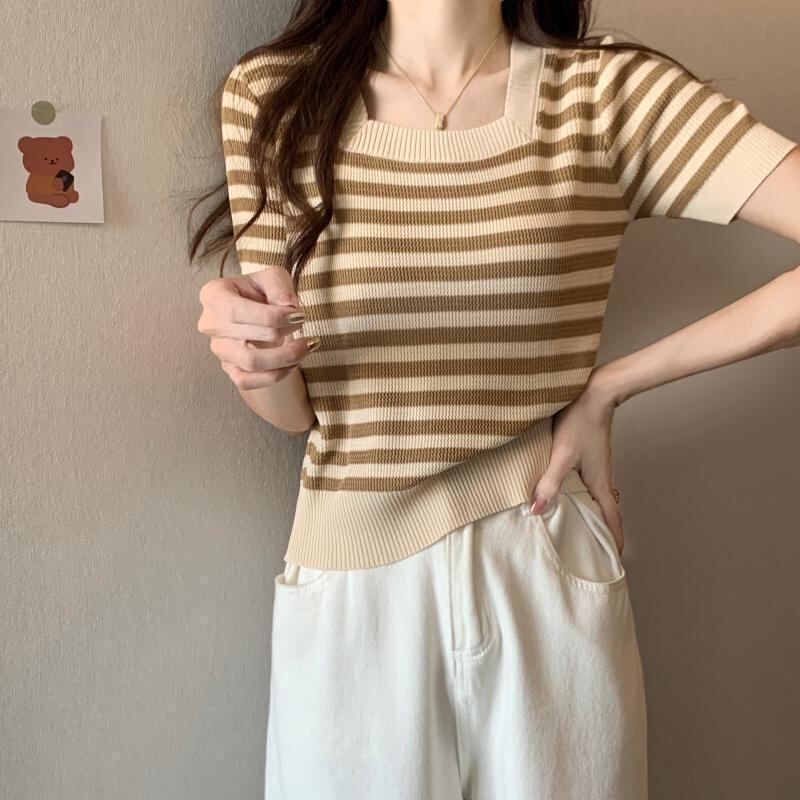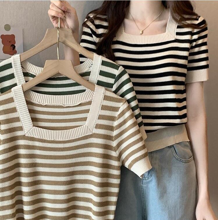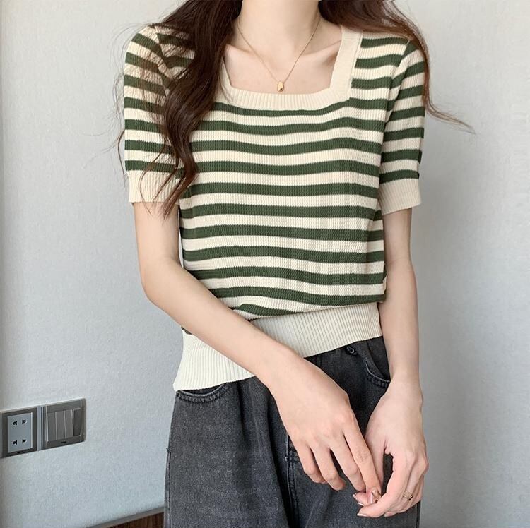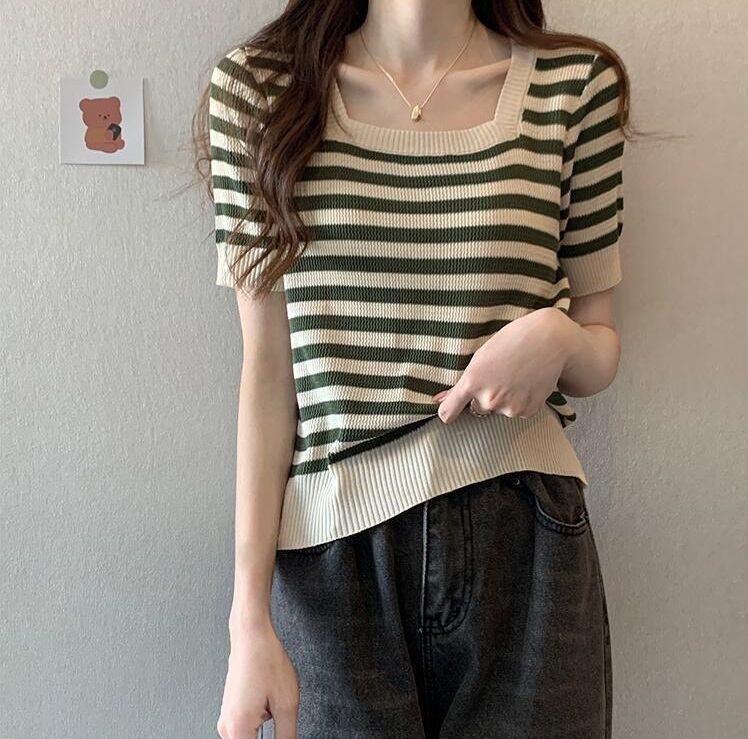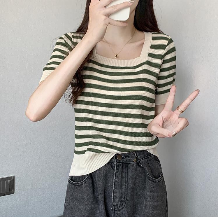 ボーダー柄 スクエアネック 半袖 ニットセーター レディース トップス ニット セーター プルオーバー サマーニット ミディアム 半袖 スクエアネック 襟なし リブ バイカラー 配色 かわいい 大人可愛い きれいめ シンプル カジュアル おしゃれ こなれ感 ボーダー 春 夏 秋 ママ 通勤 学生 学校 通学 デート お出かけ 旅行 公園 女子会 休日 ショッピング 韓国 オルチャン 普段使い 着回し S M L XL 2XL 大きいサイズ ゆったり グレー 黄色 イエロー ブルー レッド 緑 グリーン