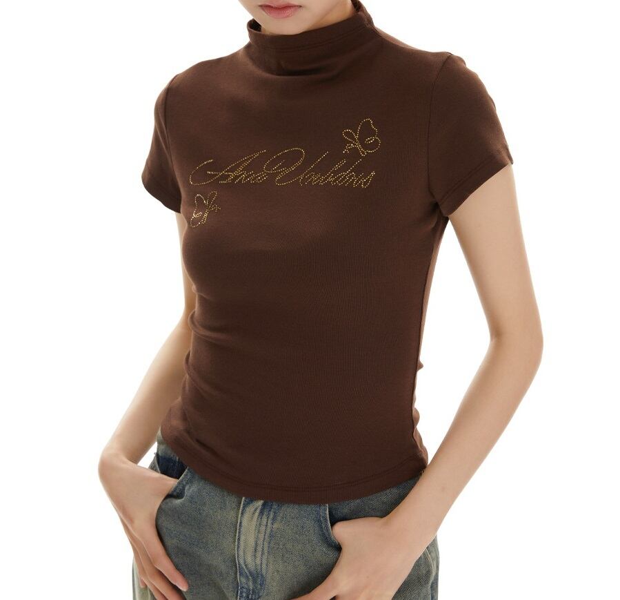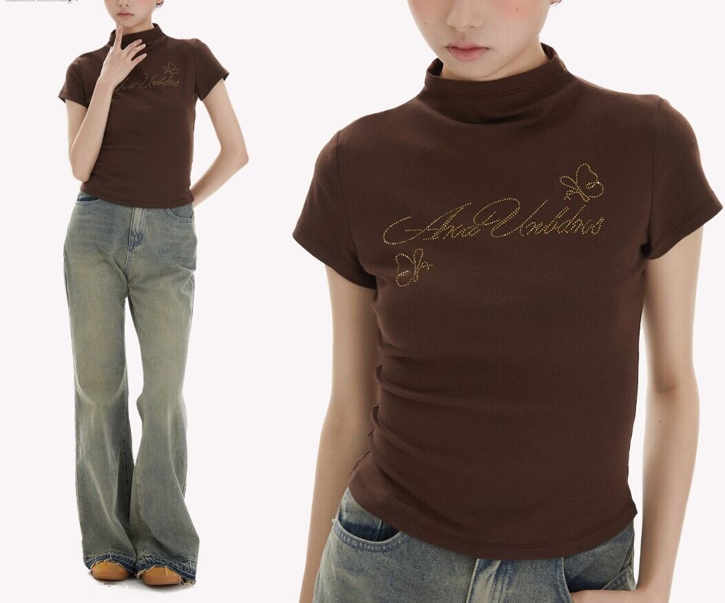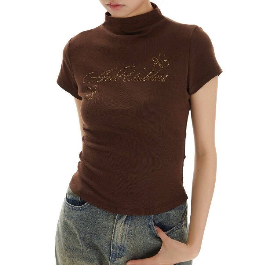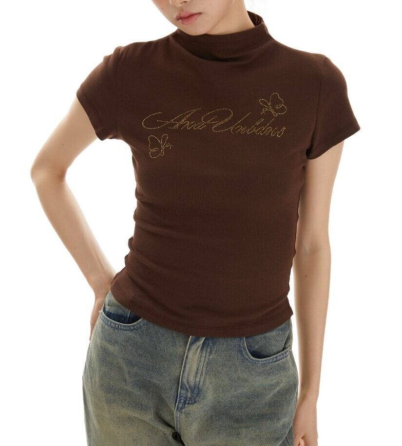 ビジュー メッセージ ロゴ 半ハイネック 半袖 Tシャツ レディース トップス カットソー プルオーバー インナー ショート 半袖 襟付き スタンドカラー ハーフハイネック スリム 細身 ビジュー かわいい 大人可愛い シンプル カジュアル おしゃれ こなれ感 ガーリー 蝶 ロゴ 英字 春 夏 秋 ママ 通勤 学生 学校 通学 デート お出かけ 旅行 公園 女子会 休日 ショッピング カフェ 重ね着 普段使い 着回し S M 黒 ブラック ピンク コーヒーブラウン