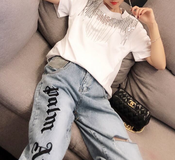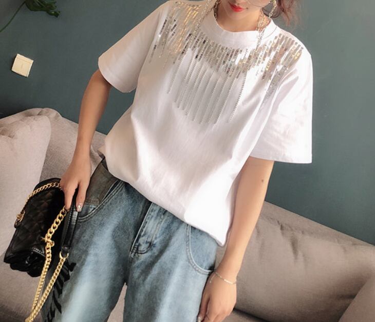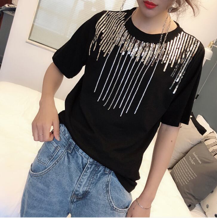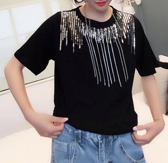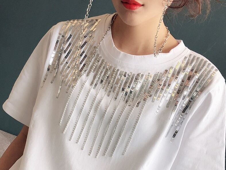 スパンコール ラウンドネック 半袖 Tシャツ レディース トップス カットソー プルオーバー インナー ミディアム 半袖 ラウンドネック 襟なし スパンコール 装飾 綿 コットン かわいい 大人可愛い カジュアル おしゃれ かっこいい こなれ感 個性的 クール 主役級 存在感 春 夏 秋 ママ 通勤 学生 学校 通学 デート お出かけ 旅行 公園 女子会 休日 ショッピング カフェ 重ね着 普段使い 着回し レイヤード M L XL 2XL 大きいサイズ 白 ホワイト 黒 ブラック