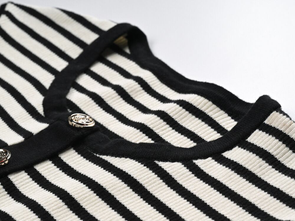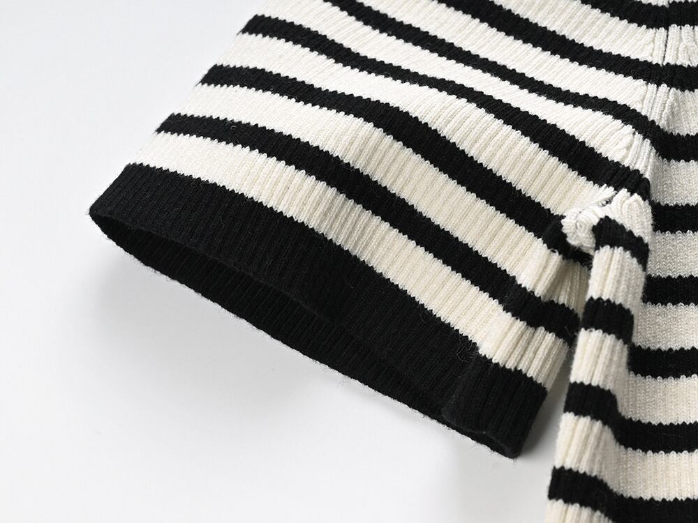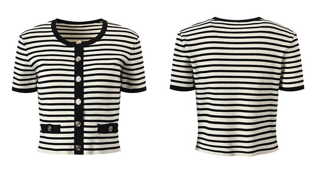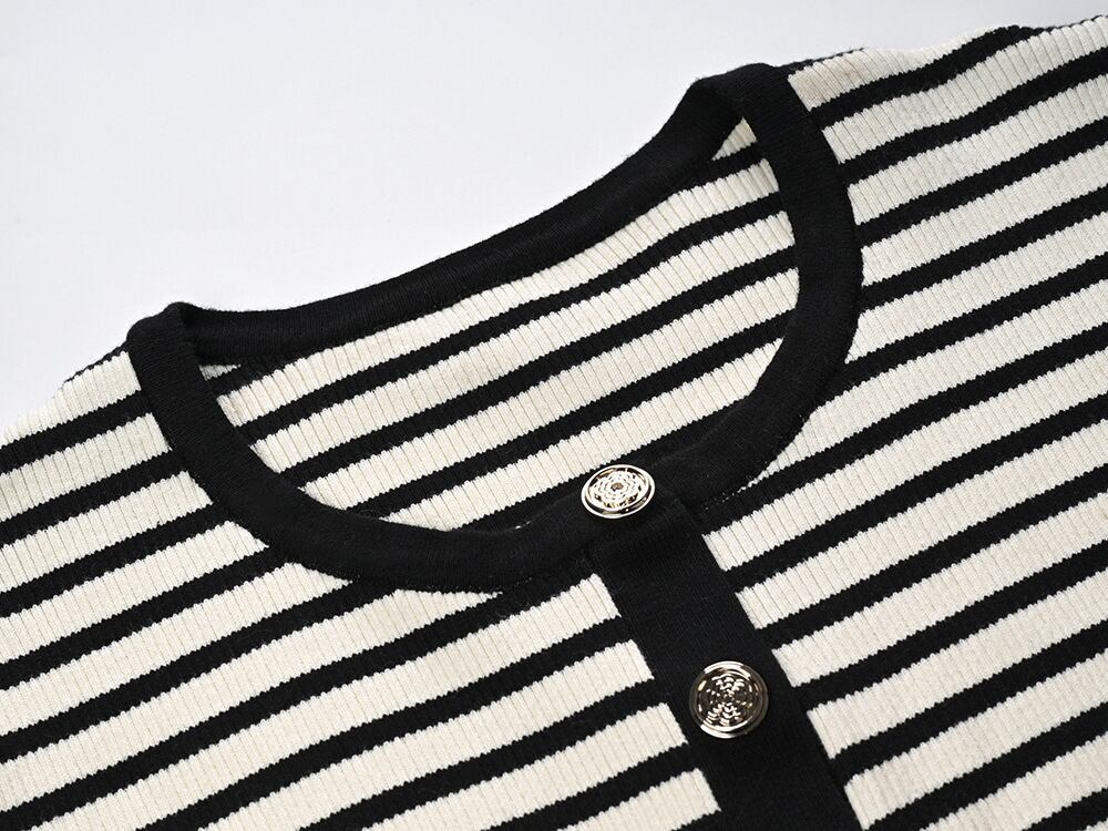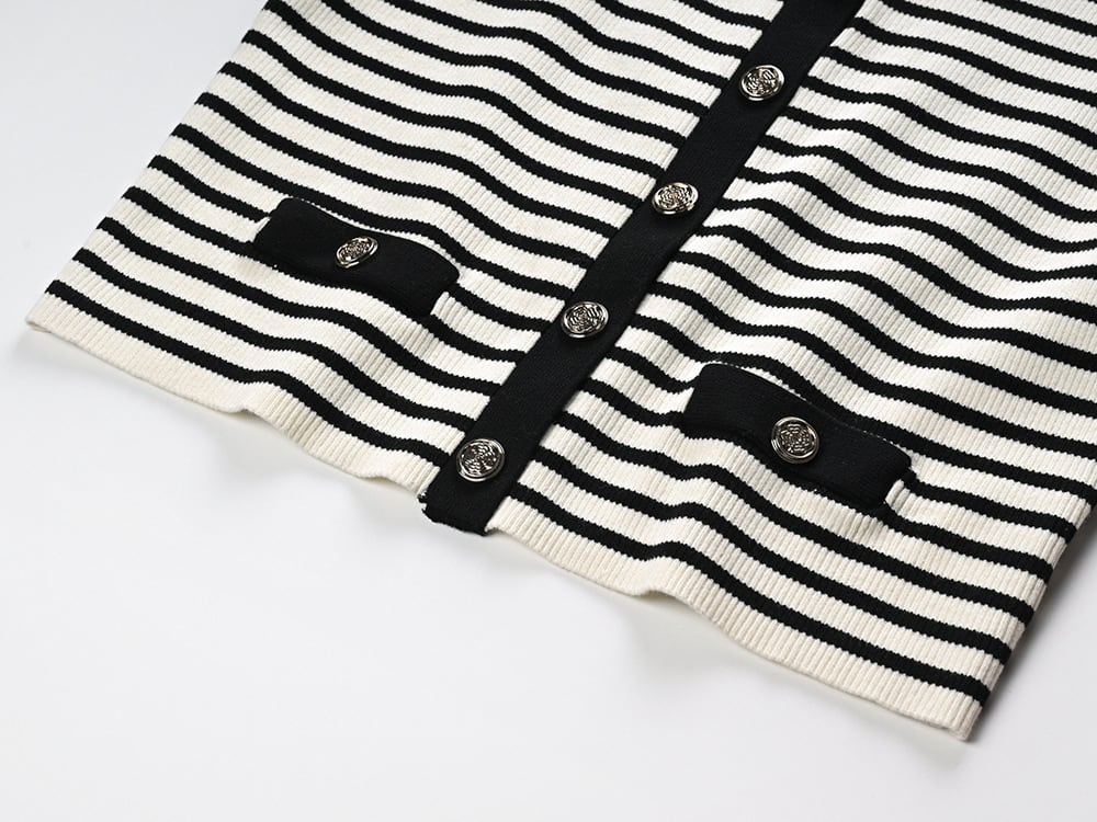 大人可愛いを演出する「ショート丈 ボーダー柄 半袖 ニットカーディガン」のご案内です!春から秋にかけてのカジュアルコーディネートにぴったりなこのアイテムは、シンプルでありながらおしゃれなデザインが特徴です。ラウンドネックで襟なしのスタイルが、上品さをプラスします!前開きのボタンデザインにはポケットも付いており、実用性も抜群です。バイカラーのボーダー柄が存在感を放ち、普段使いやお出かけ、デートなどさまざまなシーンで活躍します!