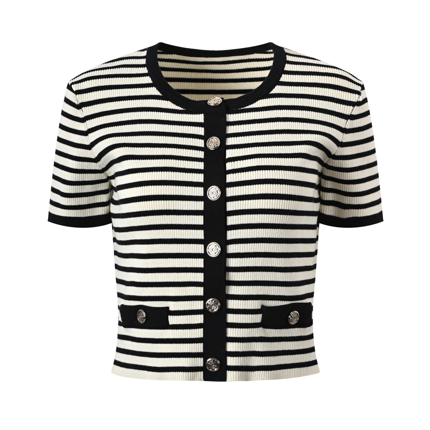 ショート丈 ボーダー柄 半袖 ニットカーディガン レディース トップス ニット カーディガン 羽織 ショート ラウンドネック 襟なし スリム 細身 ポケット 前開き ボタン バイカラー かわいい 大人可愛い きれいめ シンプル カジュアル 上品 おしゃれ エレガント 主役級 存在感 クラシカル ボーダー 春 夏 秋 ママ 通勤 学生 学校 通学 デート お出かけ 旅行 公園 女子会 休日 ショッピング カフェ モノトーン 重ね着 普段使い 着回し レイヤード S M L ボーダー柄