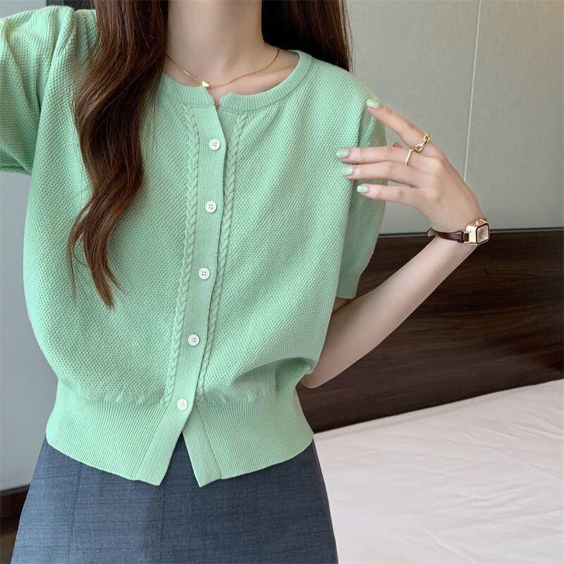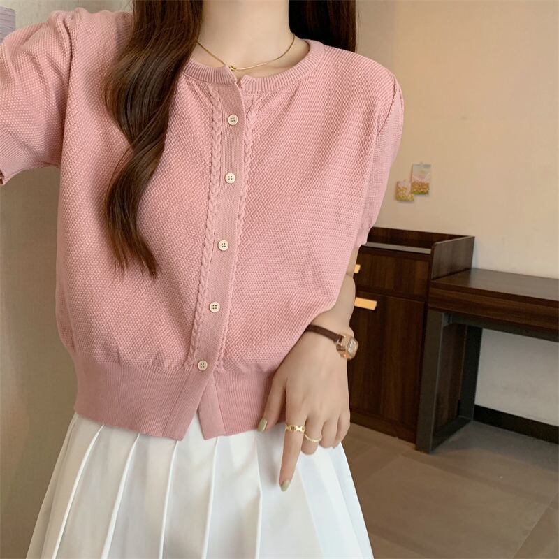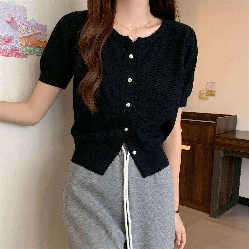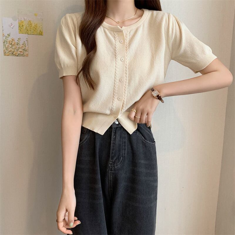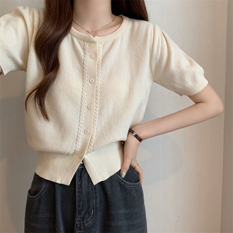 ショート丈 ラウンドネック パフ袖 ニットカーディガン レディース トップス ニット カーディガン 羽織 ショート 半袖 パフスリーブ 襟なし フェミニン リブ 前開き ケーブルニット ボタン かわいい 大人可愛い きれいめ シンプル カジュアル 上品 おしゃれ ガーリー エレガント 無地 春 夏 秋 ママ 通勤 学生 学校 通学 デート お出かけ 旅行 公園 女子会 休日 重ね着 体型カバー 普段使い 着回し レイヤード フリーサイズ 白 ホワイト 黒 ブラック ピンク アプリコット 緑 グリーン