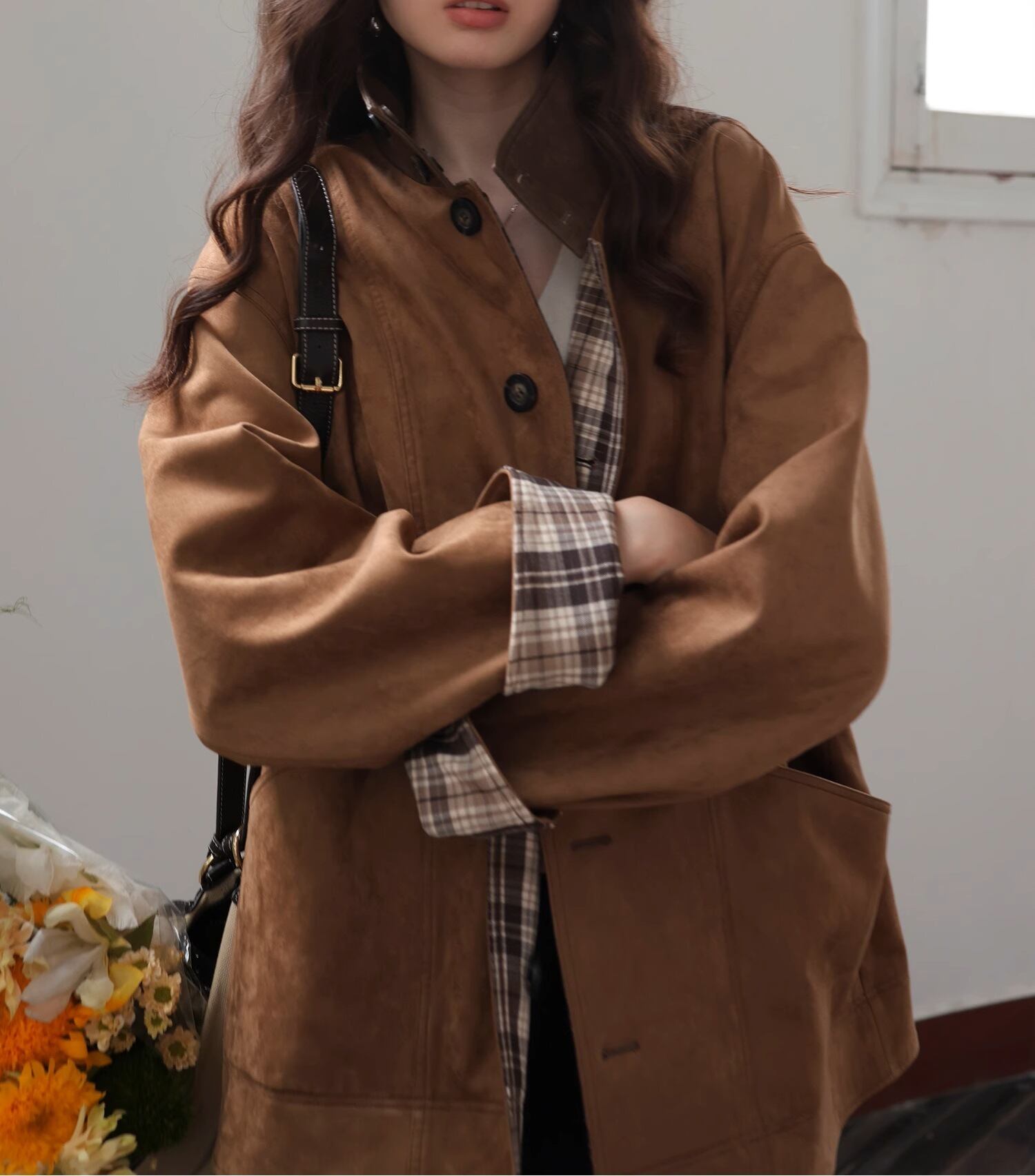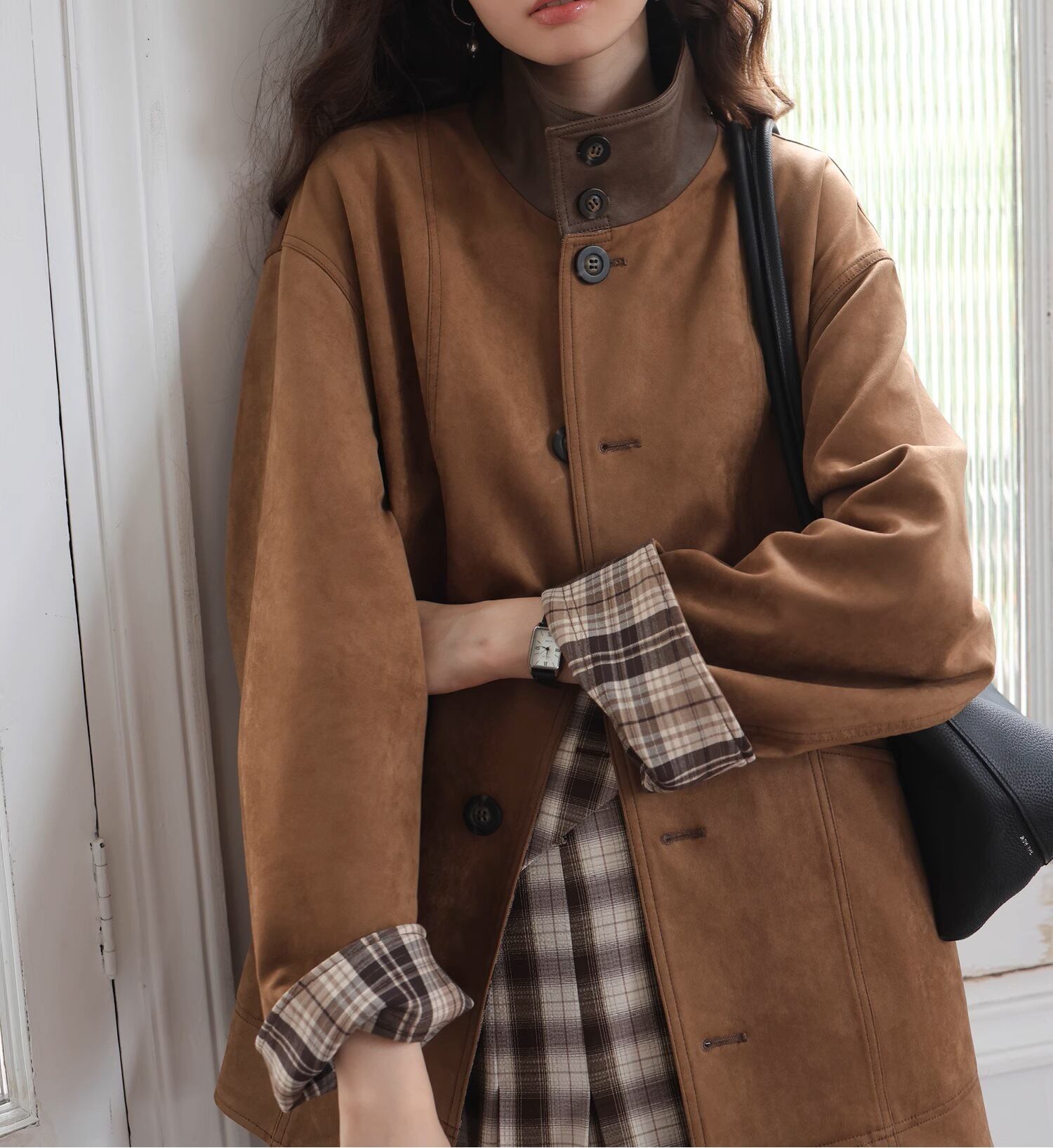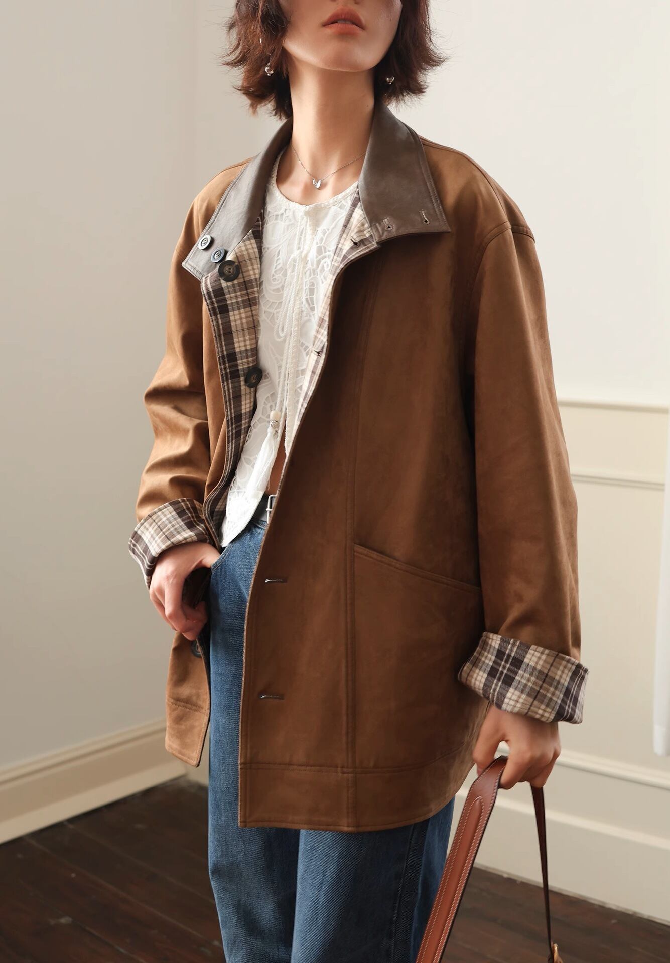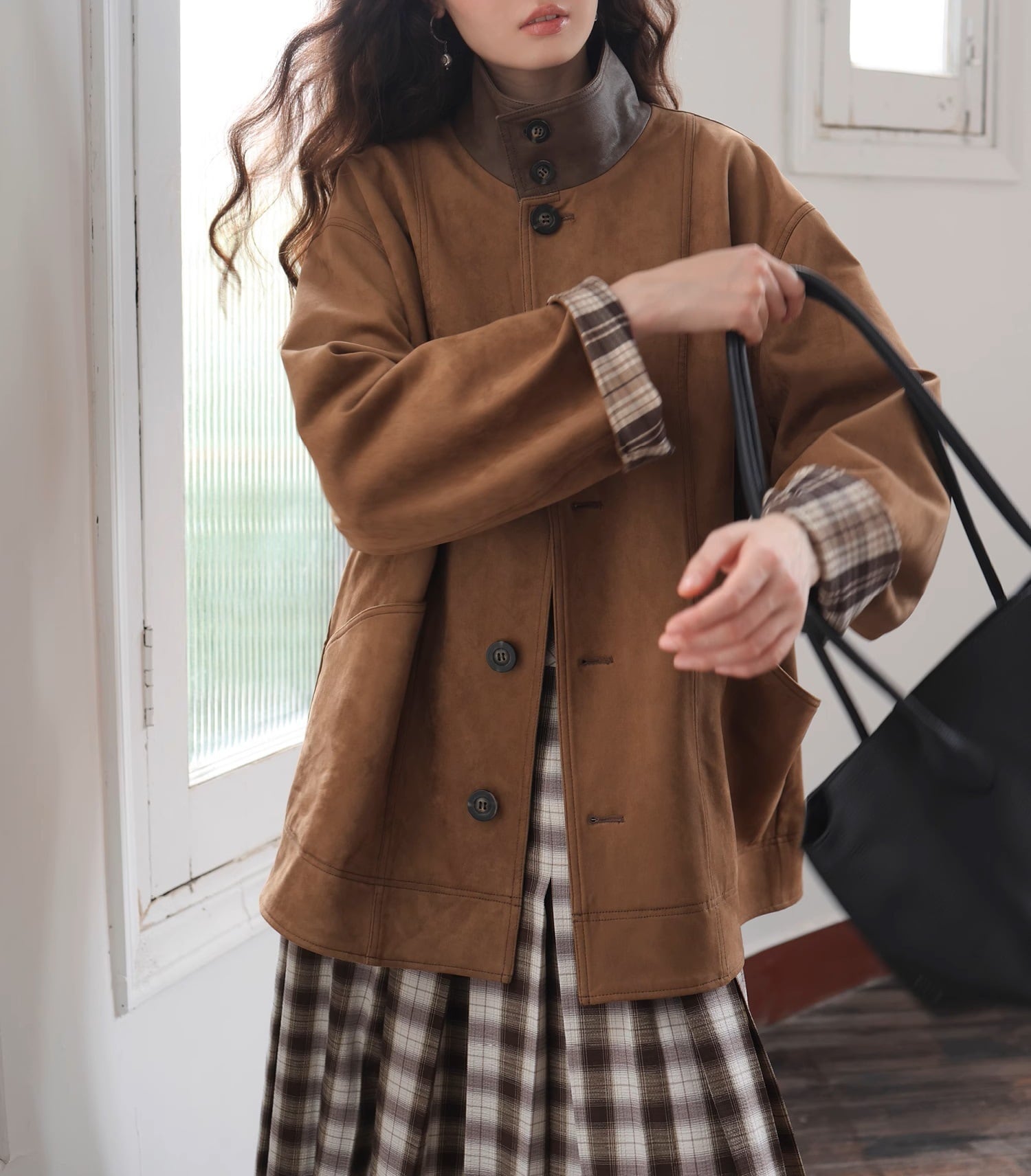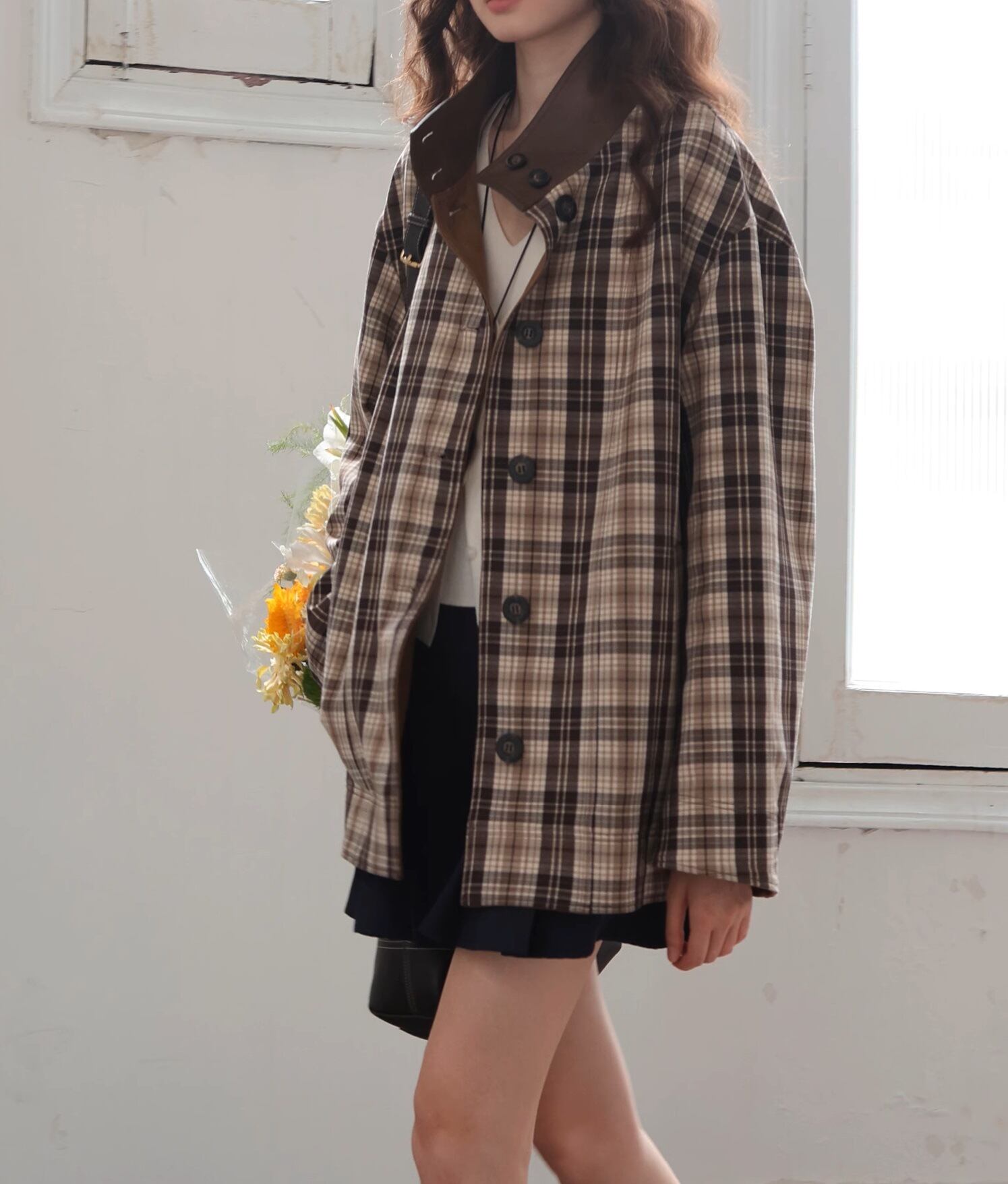 リバーシブル チェック柄 ミディアム ジャケット コート レディース トップス アウター 上着 羽織 丈長 長袖 襟付き スタンドカラー ハーフハイネック ポケット 前開き ボタン ヴィンテージ かわいい 大人可愛い シンプル カジュアル おしゃれ レトロ こなれ感 無地 チェック 格子柄 春 秋 冬 ママ 通勤 学生 学校 通学 デート お出かけ 旅行 公園 女子会 休日 重ね着 暖かい 体型カバー 普段使い 着回し レイヤード S M L 茶色 ブラウン